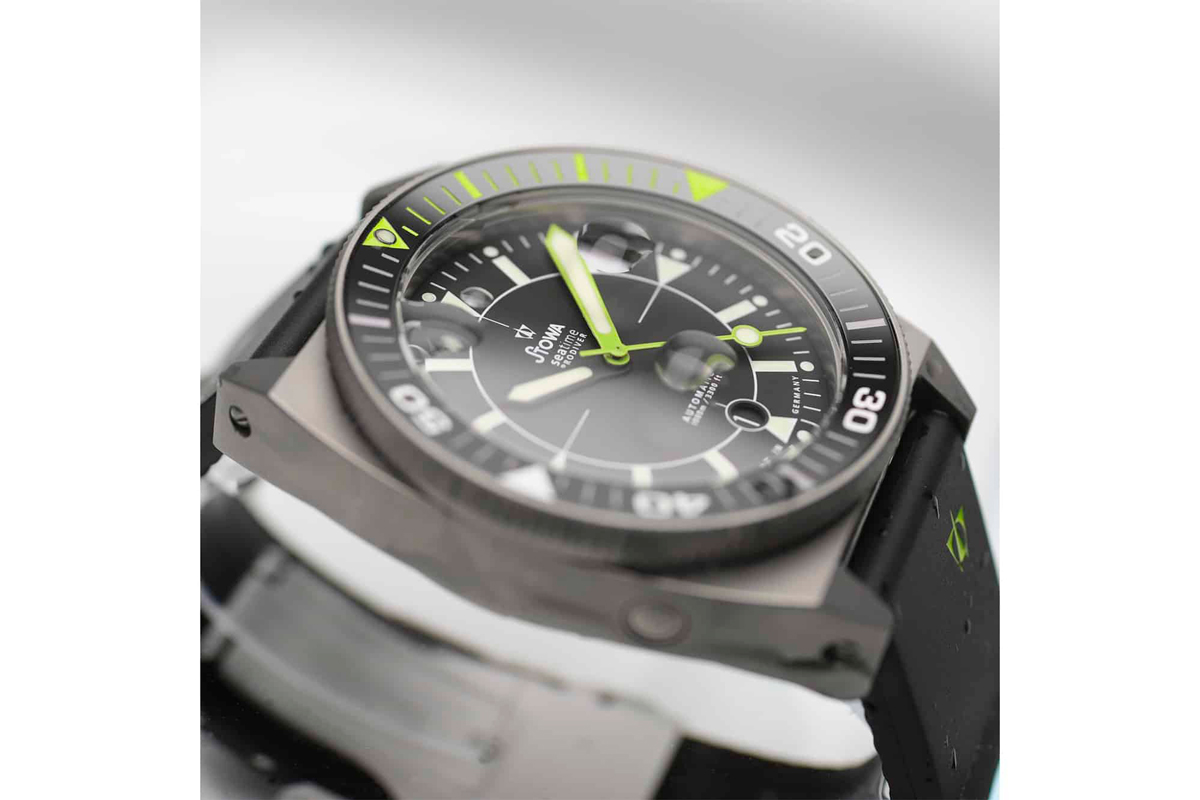 Вторая новинка - ограниченная версия Prodiver, универсальные часы Stowa для дайвинга. В этой модели Stowa определенно совмещает элементы дизайна часов для погружений 70-х годов с современными материалами и технологиями. Безель выполнен из матовой черной керамики, а 42-миллиметровый корпус изготовлен из пескоструйно обработанного титана, создавая в целом облик «tool watch». Серые тона корпуса разбавлены ярко-салатовыми цветовыми акцентами на стрелках и 15-минутном секторе дайверской шкалы безеля. Модель имеет водонепроницаемость до 1000 метров и оснащена гелиевым клапаном на корпусе, на тот случай, если вы немного увлечетесь, разглядывая красоты подводного мира и погрузитесь немного глубже запланированного. Внутри часов работает тот же ETA 2824-2, что и у предыдущей модели.