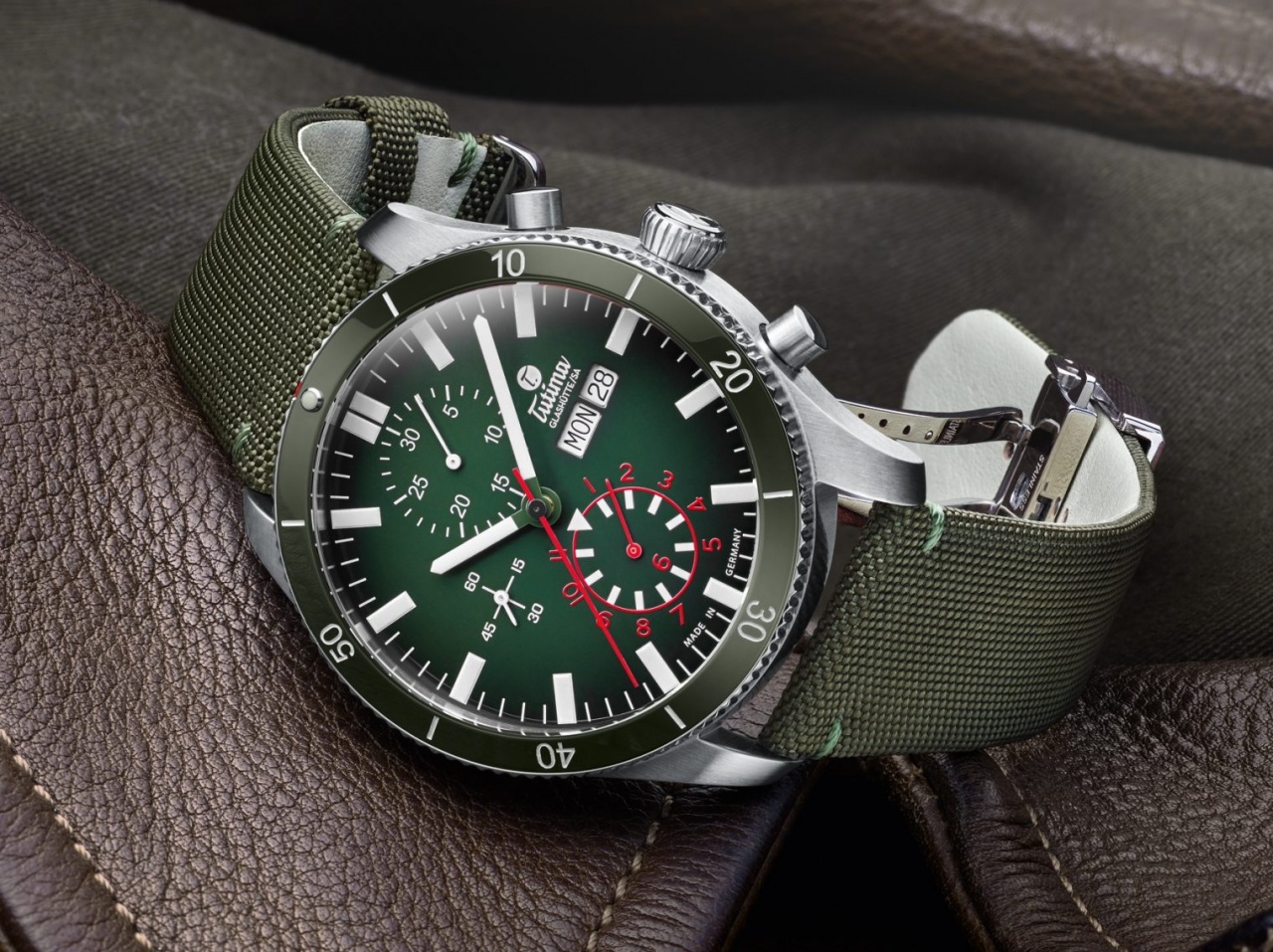 Новая пилотская модель Grand Fleiger Airport (Ref. 6406-03) от немецкой часовой компании Tutima имеет круглый матовый корпус, изготовленный из нержавеющей стали, диаметром 43,0 мм, водонепроницаемый до 200 метров. На торце завинчивающейся рифленой заводной головки, расположенной на 3 часах, выгравировано изображение логотипа бренда Tutima. Пушеры хронографа расположены на 2 и 4 часах. Вращающийся керамический безель. Задняя крышка часового корпуса глухая завинчивающаяся гравированная. Сапфировое стекло с антибликовым покрытием защищает зеленый циферблат с прямоугольными часовыми маркерами, покрытыми, как и часовая и минутная стрелки, люминесцентным составом SuperLumiNova белого цвета.