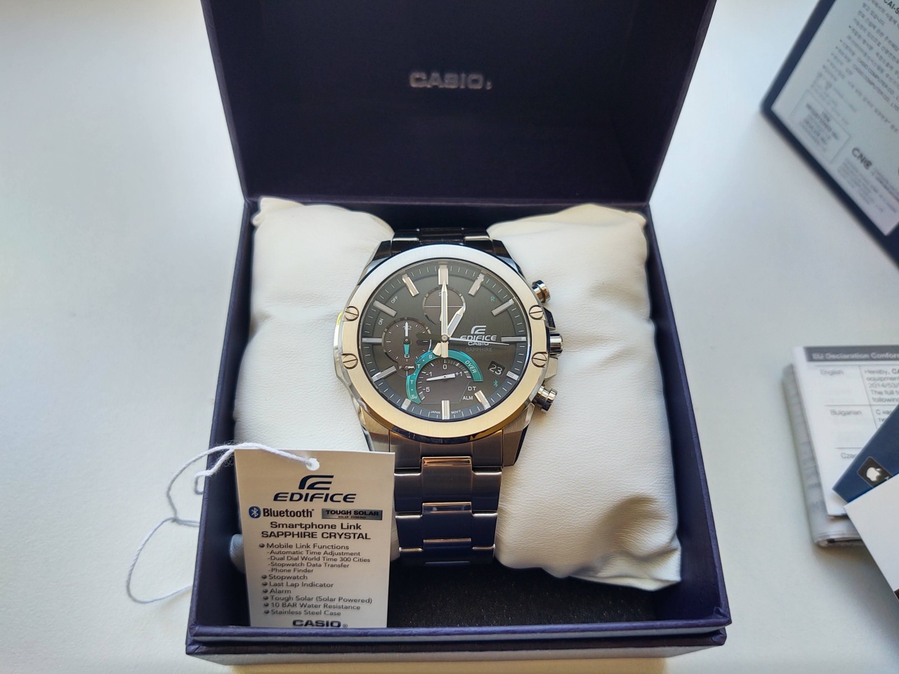 Продам ультратонкие Casio Edifice в стильном исполнении. Были куплены в сентябре прошлого года, одевал пару раз в офис. Толщина часов составляет 8.9 мм. Корпус часов выполнен из стали, стекло сапфировое. Часы синхронизируются с вашим смартфоном по Bluetooth. Заряжаются от источника света.