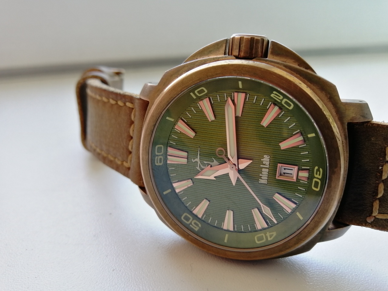 В продаже "правильная бронза" из личной коллекции от уважаемого в данном направлении производителя. Я второй владелец. Покупал по случаю из США. Состояние часов хорошее. Стекло в идеале. По корпусу мелкие следы носки, ничего критичного, на бронзе смотрится органично. Корпус помаленьку патинируется. Шикарный цифер зеленого цвета под сэндвич с накладными элементами. В живую смотрится просто шикарно и очень красиво играет на солнце. Под капотом надежный и проверенный временем NH35A от Seiko. Ход уверенный без нареканий. Люм светит как прожектор, можно освещать путь в ночи