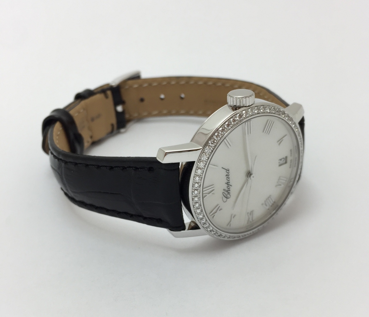 Корпус 33 мм, белое золото 750 пробы, бриллианты 0,84 карата, перламутровый циферблат, сапфировое стекло.