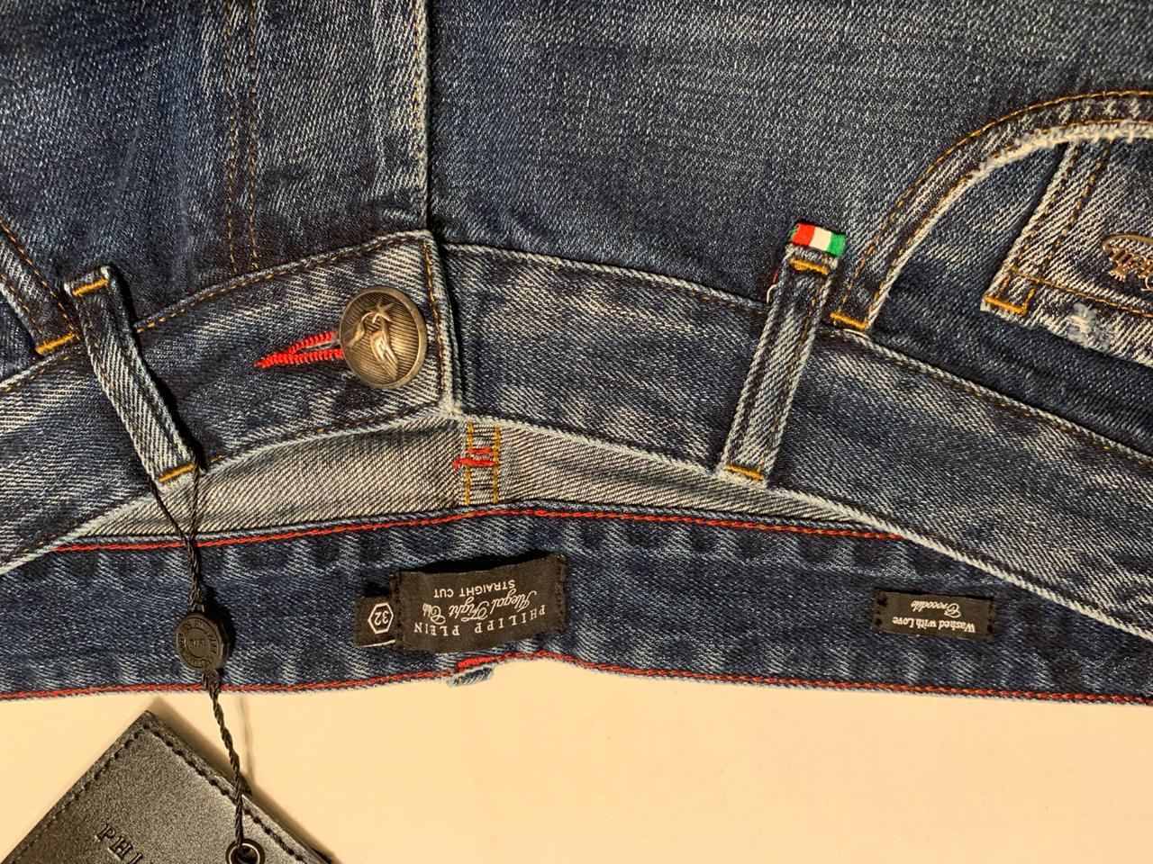 Продаются новые мужские джинсы итальянского бренда PHILIPP PLЕIN превосходного исполнения, прямые джинсы с классической посадкой из денима синего цвета, с потертостями и заплатами, пуговицы с логотипом бренда, множество карманов, заклепки с логотипом бренда, кожаные аппликации, состав: 98% хлопок, 2 % эластан, все бирки прилагаются, гарантированный 100% оригинал, размер 32, производство Италия.