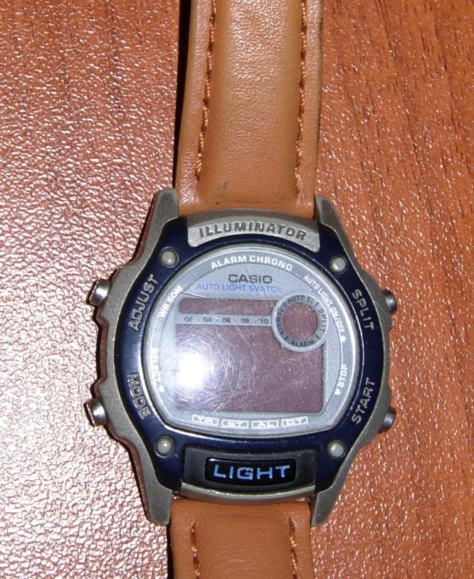 Но потом захотелось еще часов. И вот на день рождения мне дарят их, Кассио. Цифровые, как было модно, все понты. Автоматическая подсветка, когда поворачиваешь их под угол 60 градусов, будильник, секундомер, обратный отсчет времени, второй часовой пояс и т.д. Их я сразу определил для носки на дачу. Помню многим они там нравились. А какой у них был ремешок! Очень классный (правда щас он перетерся, поменял на «кожу» из перехода за 150р. Притом это было в первый день, когда я приобрел Ролех. В общем Ролех был на руке, Касио в руке. Спускаюсь в переход, говорю надо ремешок на вот эти часики и протягиваю Касио. на что получаю ответ что есть, 400 р. Я делаю глаза на выкат и говорю что дорого, давай ченить подешевле. Показывают за 300р. Говорю - дорого. Смотрю на витирину и вижу ценник 150р. Вот этот вот, рыженький, за 150 который, и хрен с ним что не в цвет)).