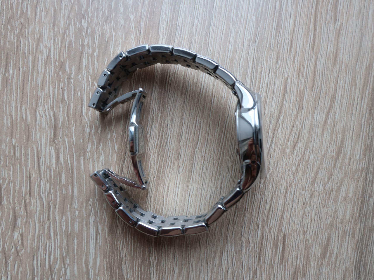 Часы надевали несколько раз. Состояние новых. При замене батарейки немного поцарапали заднюю крышку. Браслет уменьшен на запястье 14,5-15 см. Снятые звенья в комплекте.