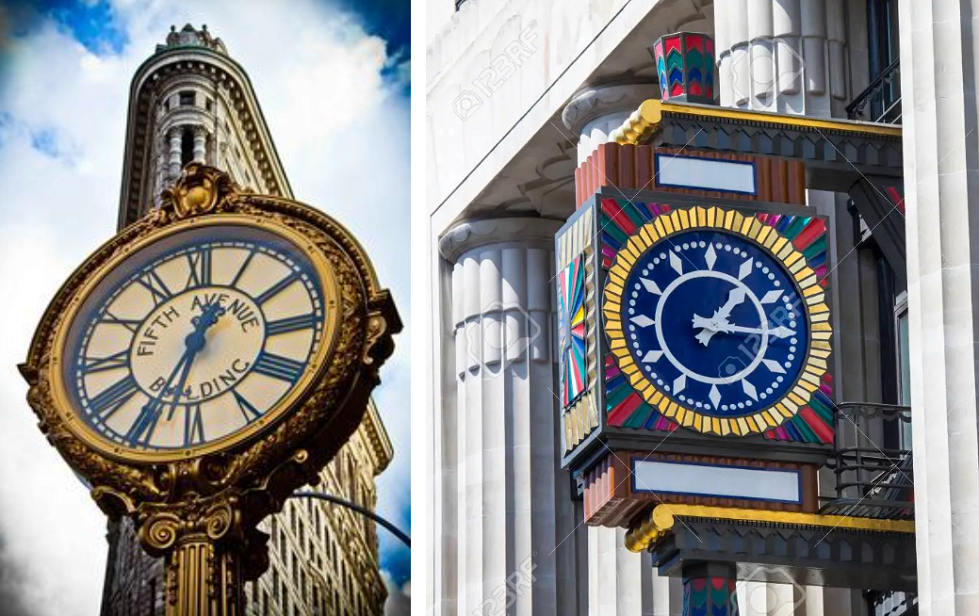 Слева: уличные часы на 5 авеню, Нью Йорк. Справа: часы на фасаде здания Daily Telegraph, Лондон. Фото из сети