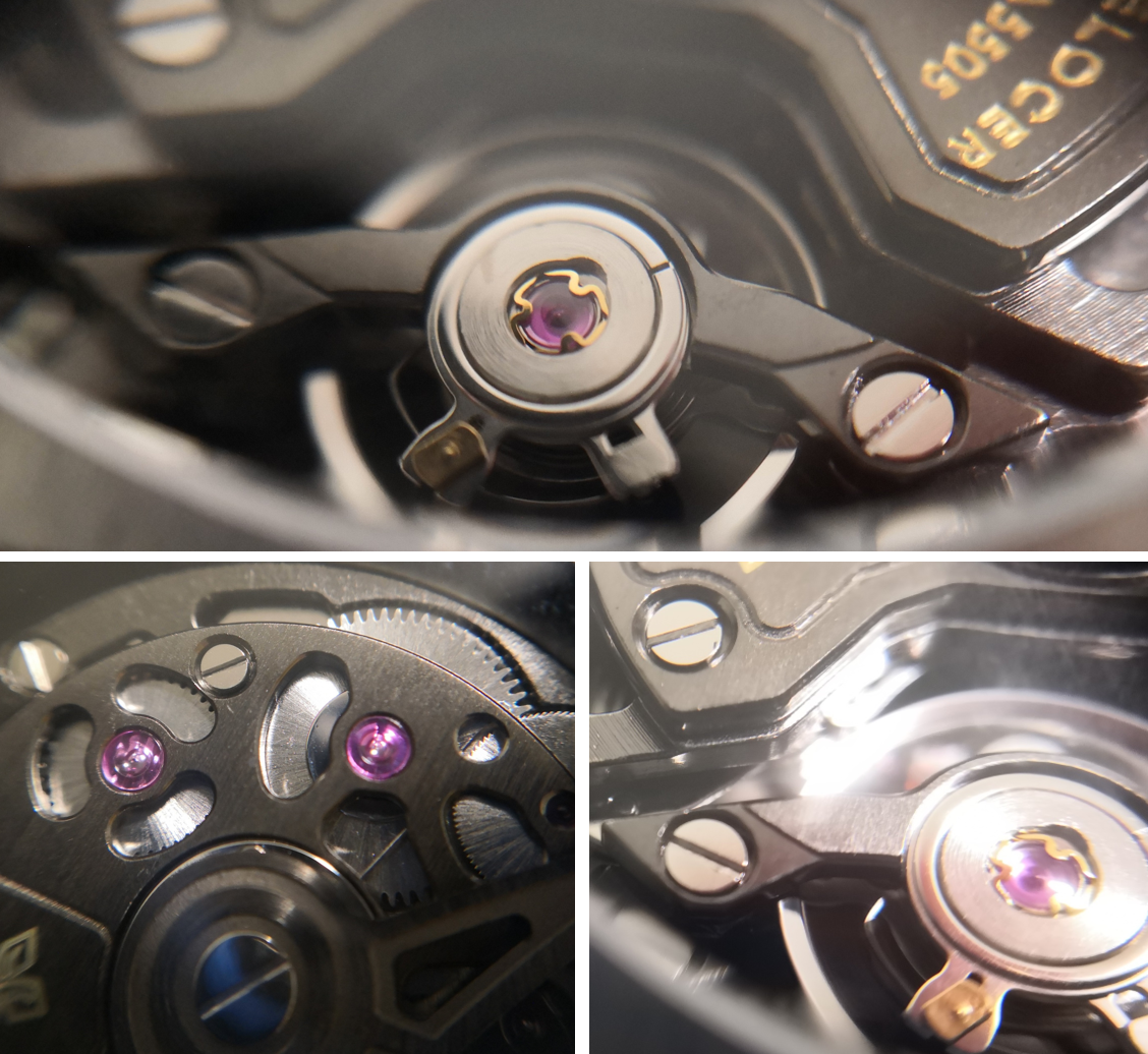 Смотрится он хорошо. Сложной отделки вроде перлажа и “женевских полос” нет, но благородное темно-серое DLC-покрытие мостов и платин, контрастирующее с серебристой колесной передачей, выглядит если и не дорого, то по крайней мере интересно. В виде украшения — золото гравированных надписей и полированные винты (хотя в макро видно, что качество хромает). А еще — зеркально полированные, в отличие от матовых поверхностей, тонкие фаски мостов.