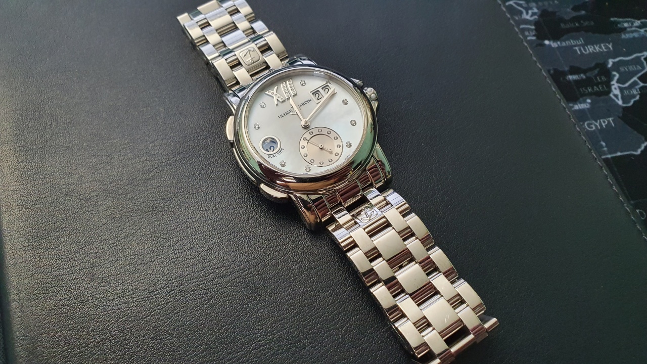 В комплекте: коробка, документы и абсолютно новый оригинальный серый ремешок из кожи аллигатора с застежкой.
