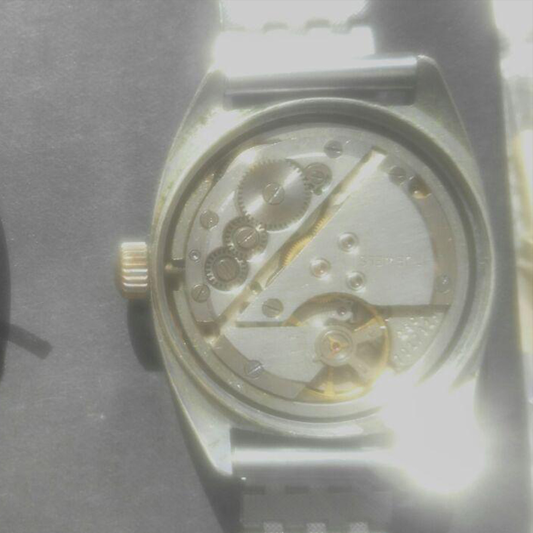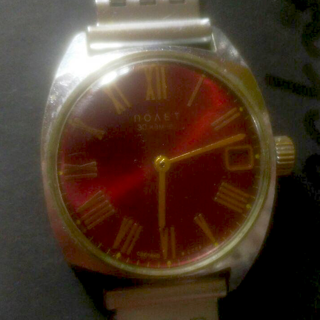 1) Полёт 30 Камней - Красный Циферблат, Хромированный Корпус. Смущает в принципе всё, да тут не хватает календаря и секундной стрелки так как реставрация не проводилась, но стоит ли её вообще делать? Из информации, что я нашел в интернете, насколько мне известно подобный циферблат встречался в люксовой модели костюмных часов с золотым корпусом и автоподзаводом - никаких упоминаний о такой версии с подобным корпусом я не встречал - так что же это, просто куча деталей от разных моделей?