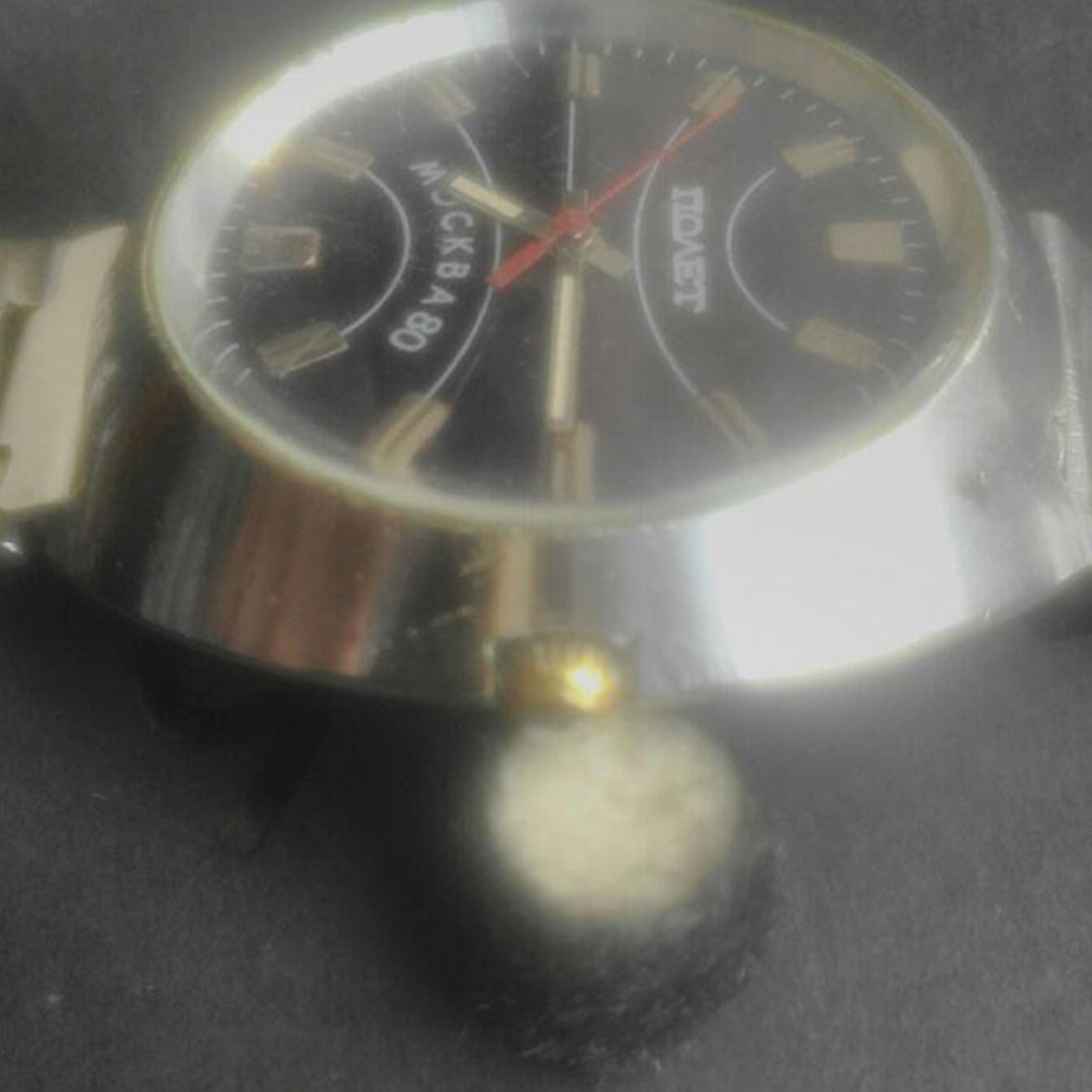 2) Полёт - Москва 80. Смущает что на корпусе нет выреза в виде кольца чуть ниже стекла, вроде бы в родном корпусе таких моделей он был - или это связанно с разными годами выпуска серий? Так же не ясно родная ли задняя крышка для данной модели с таким циферблатом, на ней изображен знак качества. А там где механизм вместо довольно часто встречающегося пластмассового кольца держателя механизма стоит металлическое.