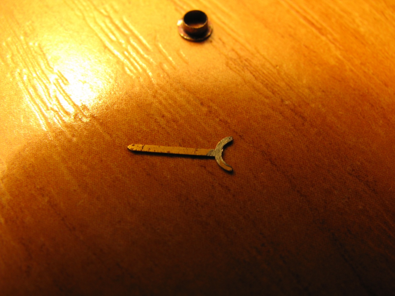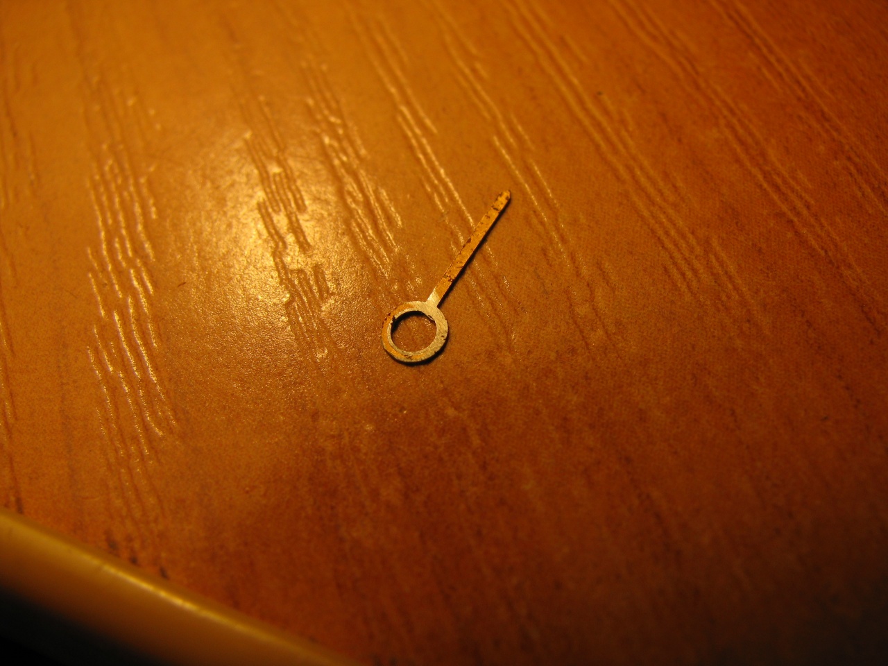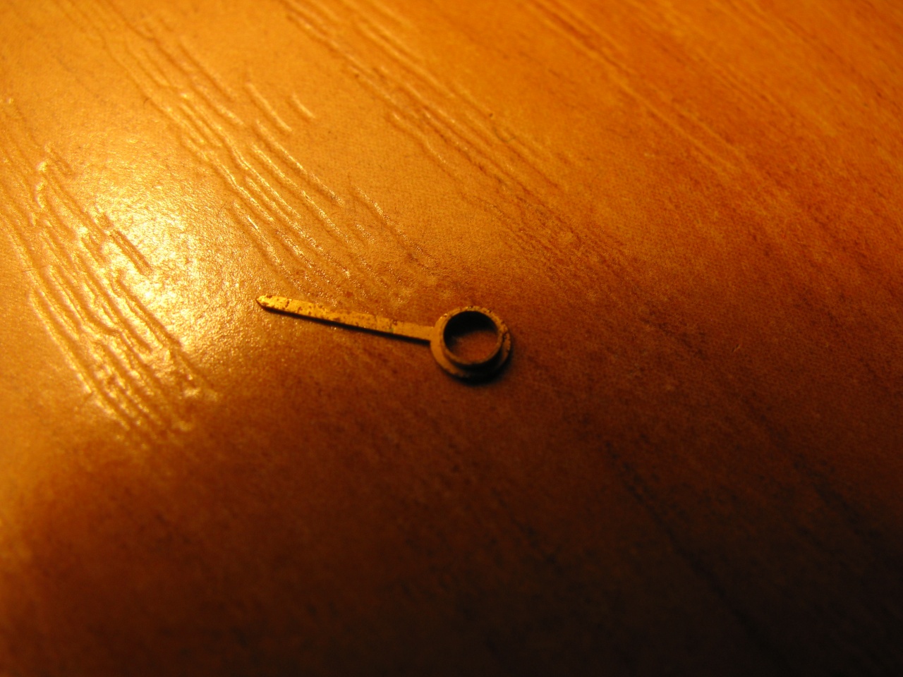 здравствуйте. хочу поделиться опытом ремонта часовой стрелки на карманных часах. стрелка была отломана в наиболее хрупком месте - у самого основания ( большой градиент ширины ). пришла в голову идея припаять на тонкую пластину. за основу взял слегка покрытую коррозией ( чтоб не жалко было ) часовую стрелку от Poljot de luxe automatic ( вечная ей память ), у сей модели широкий часовой триб и одновременно тонкая прочная стальная стрелка. сначала сточил на точиле трубочку, чтоб стрелка стала плоской. потом на том же точиле убрал половину окружности. часовой триб карманника оказался всё же шире Полёта, поэтому пришлось остаток отверстия доточить алмазным круглым надфием, так, чтоб при прикладывании к основанию поломанной стреки, ничего не выступало. облудив спаиваемые поверхности ортофосфорной кислотой, припаял сначала пластинку к основанию стрелки, потом аккуратно и само копьё ( так, чтоб не успел расплавиться припой у основания ). убрал квадратным надфилем остаток припоя и промыл в воде стрелку. основная проблема - следить, чтоб кислота не попала на воронёную внешнюю поверхность стрелки