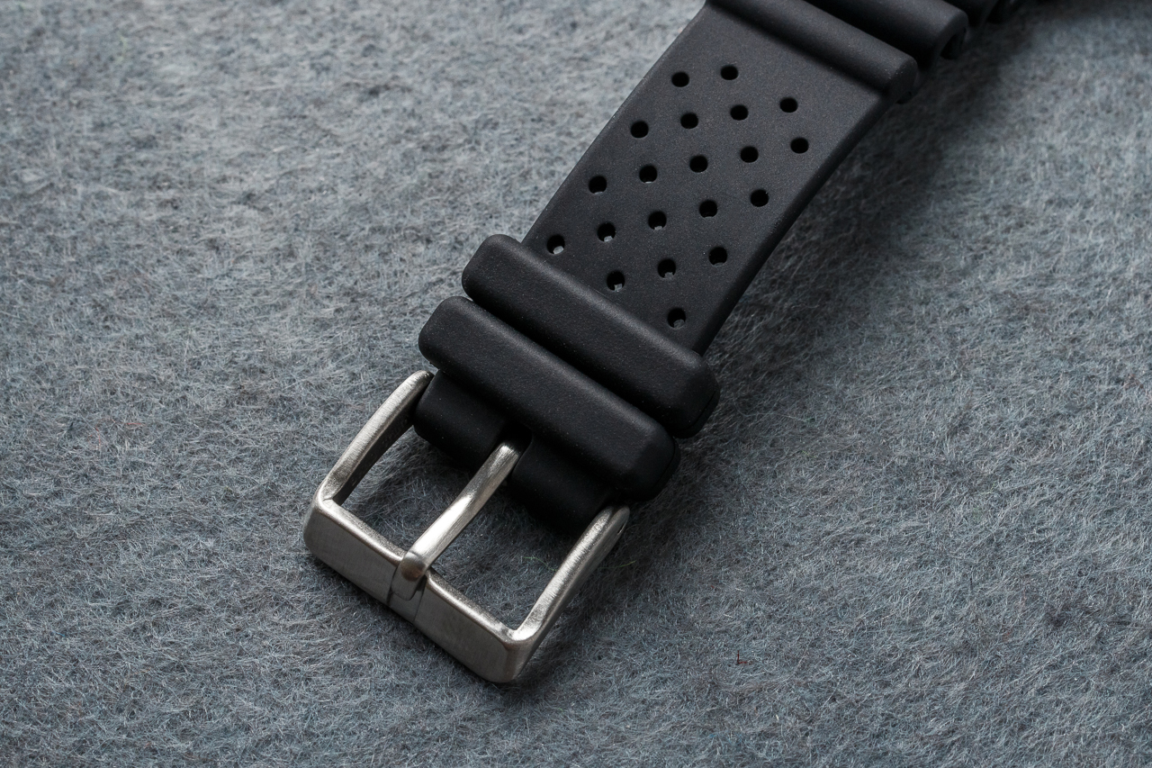 Ремень из резинопластика или аналогичного материала средней жесткости. К счастью, это не силикон, который притягивает пыль и не держит форму. Ремень на этой модели после какого-то времени принимает форму руки и довольно комфортен. Неплох по длине, я бы сказал, есть запас до 22 см запястья точно.