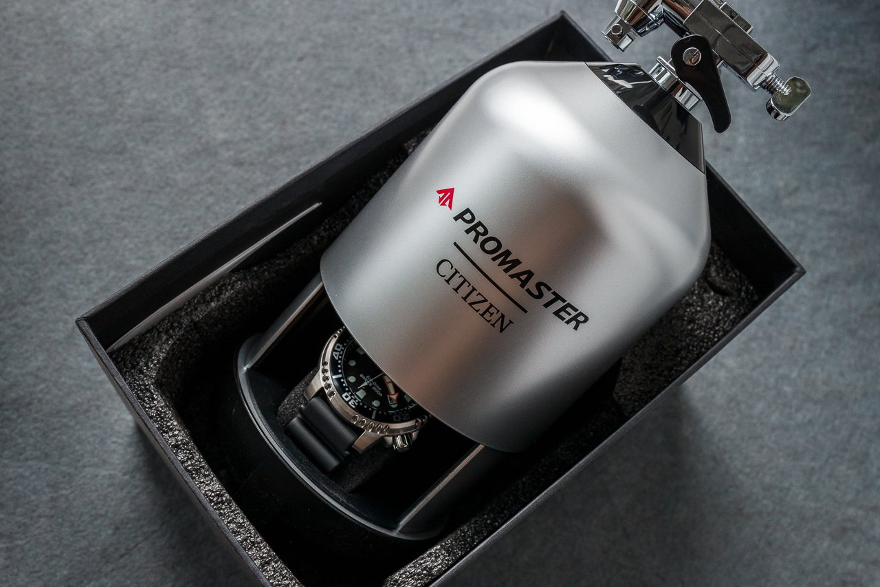 Помимо черной упаковки с уплотнителям, упаковка представляет собой стилизованную модель акваланга - симпатичную и позволяет покупателю ощутить некую причастность к покорению глубокого синего моря