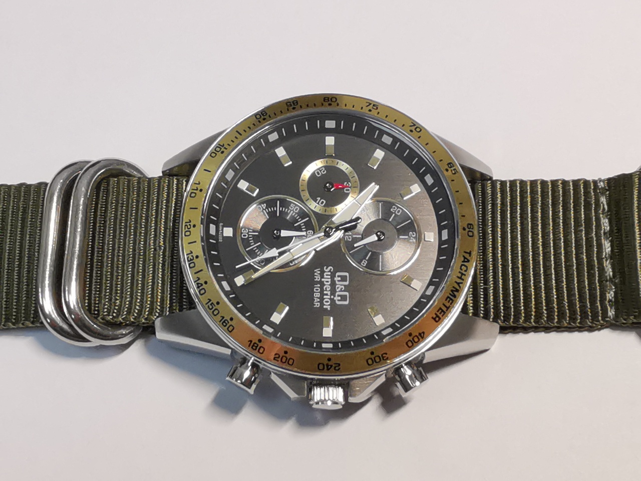 Циферблат графитового цвета, имеет заметное продольно-вертикальное сатинирование, под определенным ракурсом поблескивает. На основном циферблате размещены три малых циферблата. Верхний показывает время в 24х часовом формате, нижний- секундомер, и боковой - счетчик секундомера на 30 минут. Окошка даты к сожалению нет. Малые циферблаты окаймлены золотыми ободочками. Все надписи на циферблате: Q&Q Superior, wr 10 bar, s394j222, выполнены белой краской. Часовые метки накладные, выполнены в виде золотых прямоугольников с нанесенными на верхнюю их половину люминофорными красками, квадратиков по ширине меток.