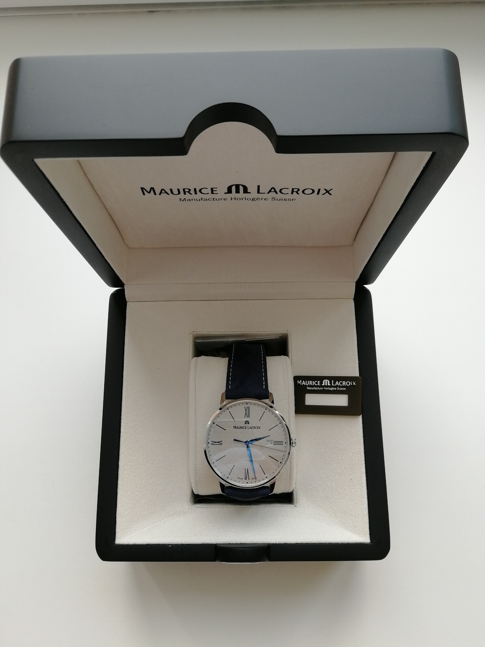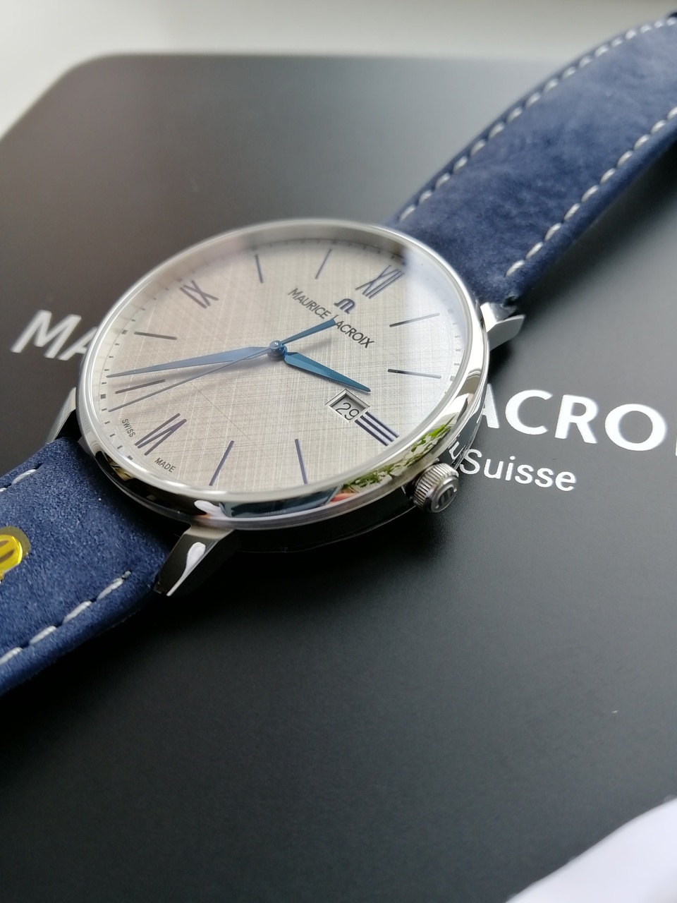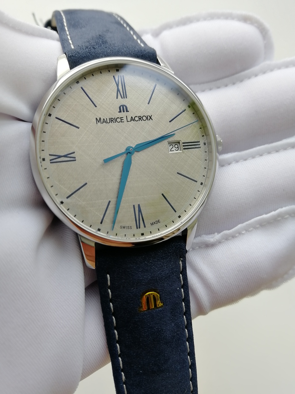 В продаже шикарные и довольно редко встречающиеся классические часы от именитого бренда с очень интересным и запоминающимся дизайном. Серебристый цифер с текстурой похожей на ручное раскрашивание карандашом, синие стрелки, красиво играющие и переливающиеся на солнце, синий кожаный ремешок отличного качества. Цифер смотрится очень богато и необычно. Уровень исполнения и внимания к деталям на высоте. Восторженные и заинтересованные взгляды окружающих обеспечены