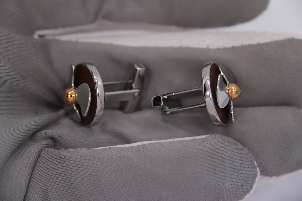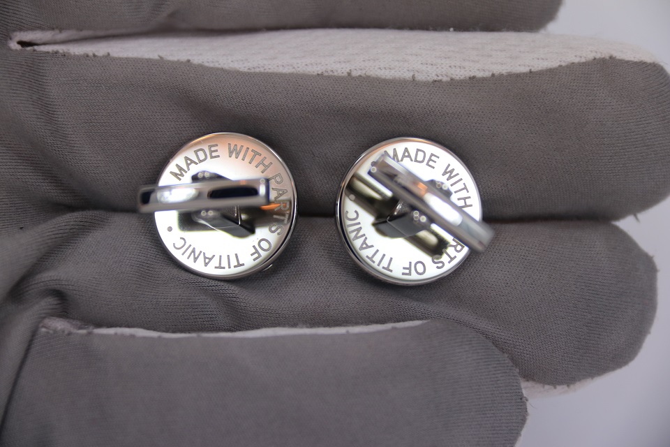 Запонки украшены миниатюрной копией свободновращающегося корабельного винта на подложке из стабилизированной ржавой стали с обшивки затонувшего Титаника, поднятой со дна океана.