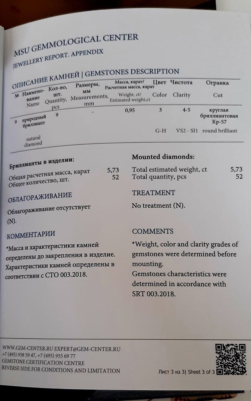 Все бриллианты сертифицированы до закрепки в гемцентре МГУ, это отражено в аттестате.