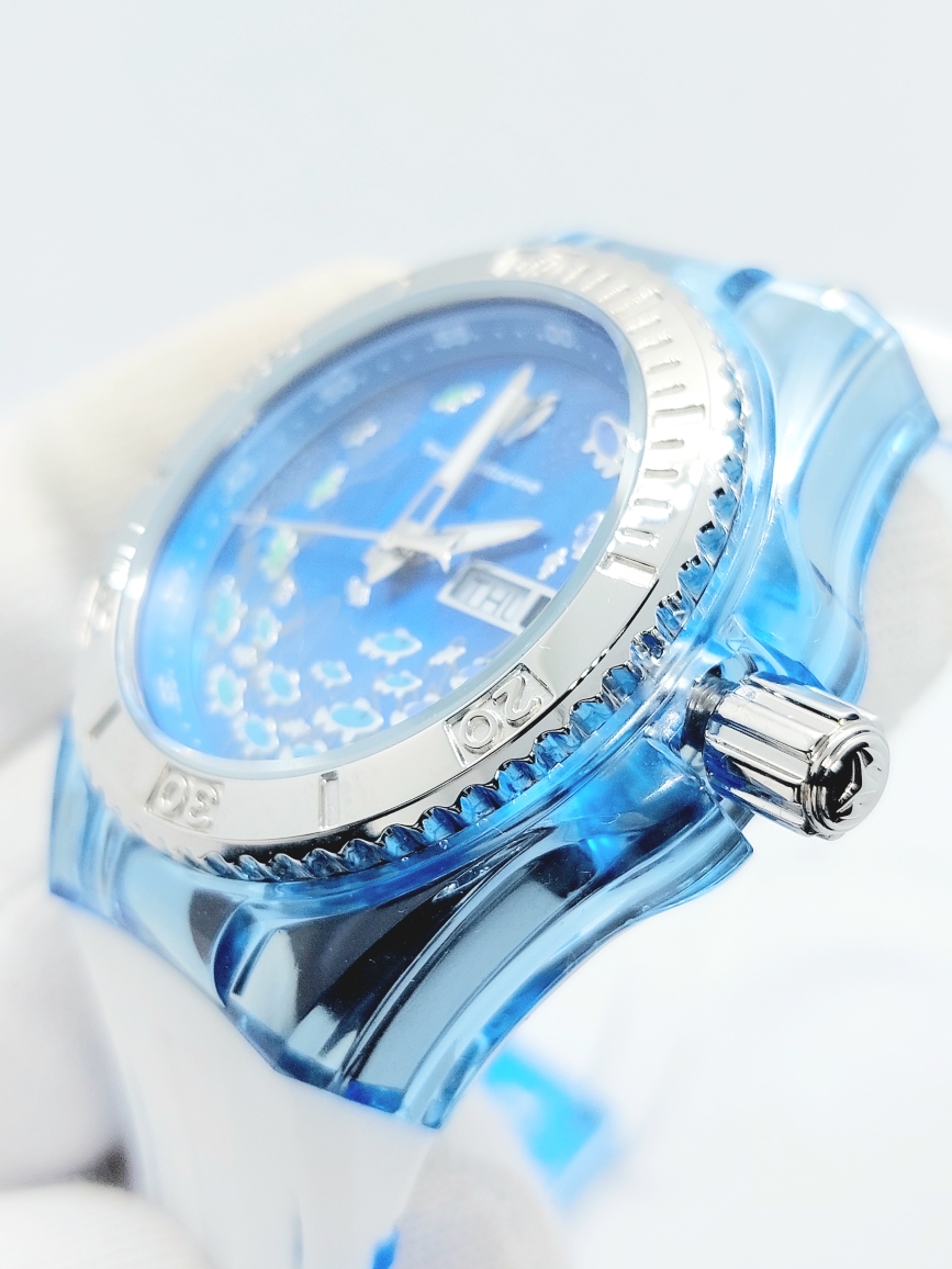 Корпус часов диаметром 40 мм выполнен из нержавеющей стали отполированной до блеска и защищен прозрачным силиконовым чехлом синего цвета.