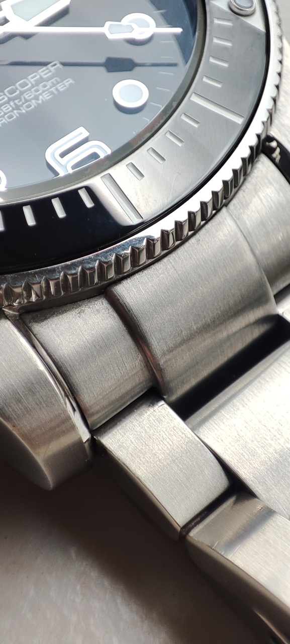 Браслет тоже очень хорош: пятизвенный, с продольной ложбинкой внутренних звеньев, с четкими гранями, с глубокой гравировкой логотипа на застежке-бабочке. С полировкой всех поверхностей, включая внутренние части звеньев. И даже не спрашивайте, сколько царапин соберет эта полировка, когда браслет несколько месяцев потрется о столы, подоконники и прочие твердые поверхности.
