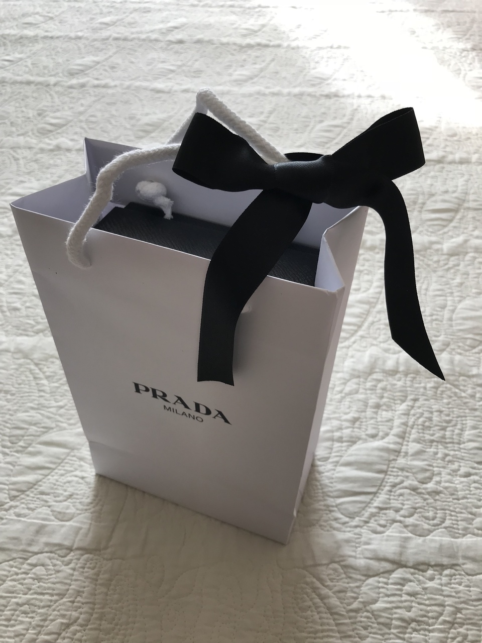 На двух крепких кнопках, внутри множество карманов, отделов и слотов чтобы можно было легко разложить все необходимое. Встроенная визитница, на золотой изящной цепочке, на 3-4 карточки и с прозрачным кармашком. Крепиться внутри на кнопку, можно легко отстегнуть и использовать как пропуск или отдельную визитницу. Кошелек легкий и стильный и от PRADA.