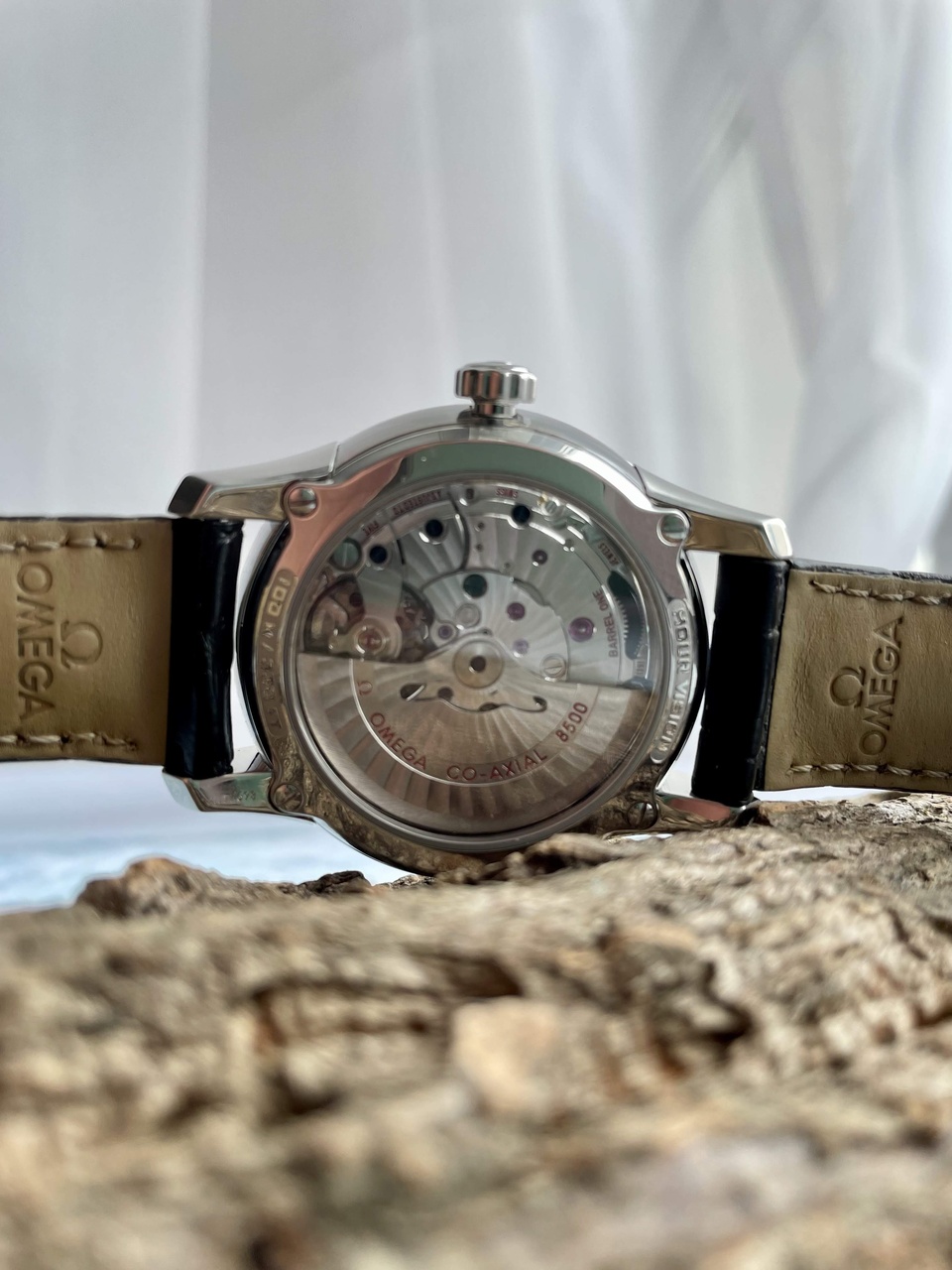 В этой изысканной модели используется коаксиальный механизм OMEGA, калибр 8500, который хорошо виден сквозь прозрачную заднюю крышку, а также со всех четырех сторон корпуса.