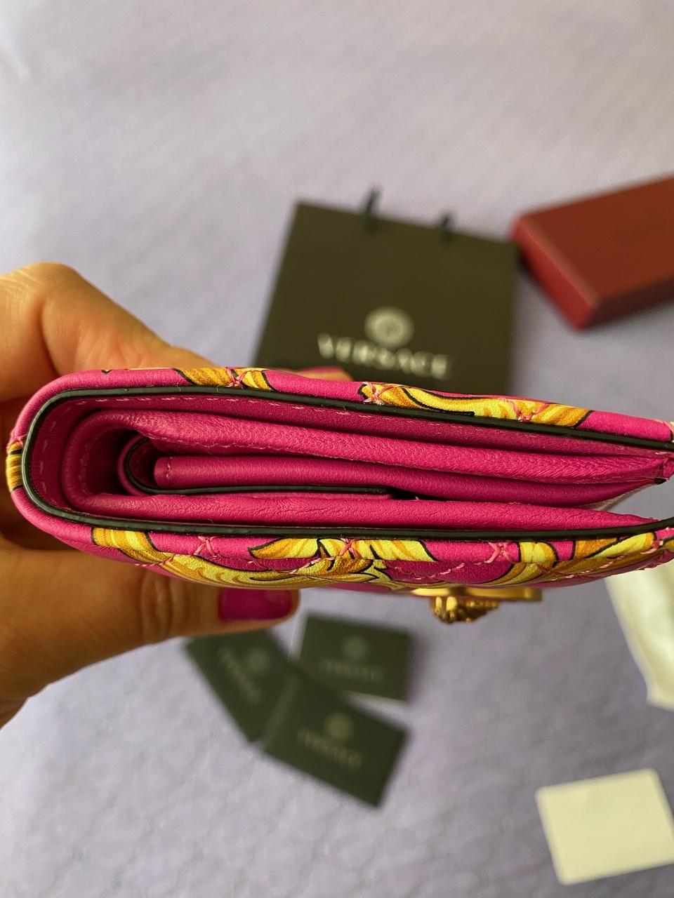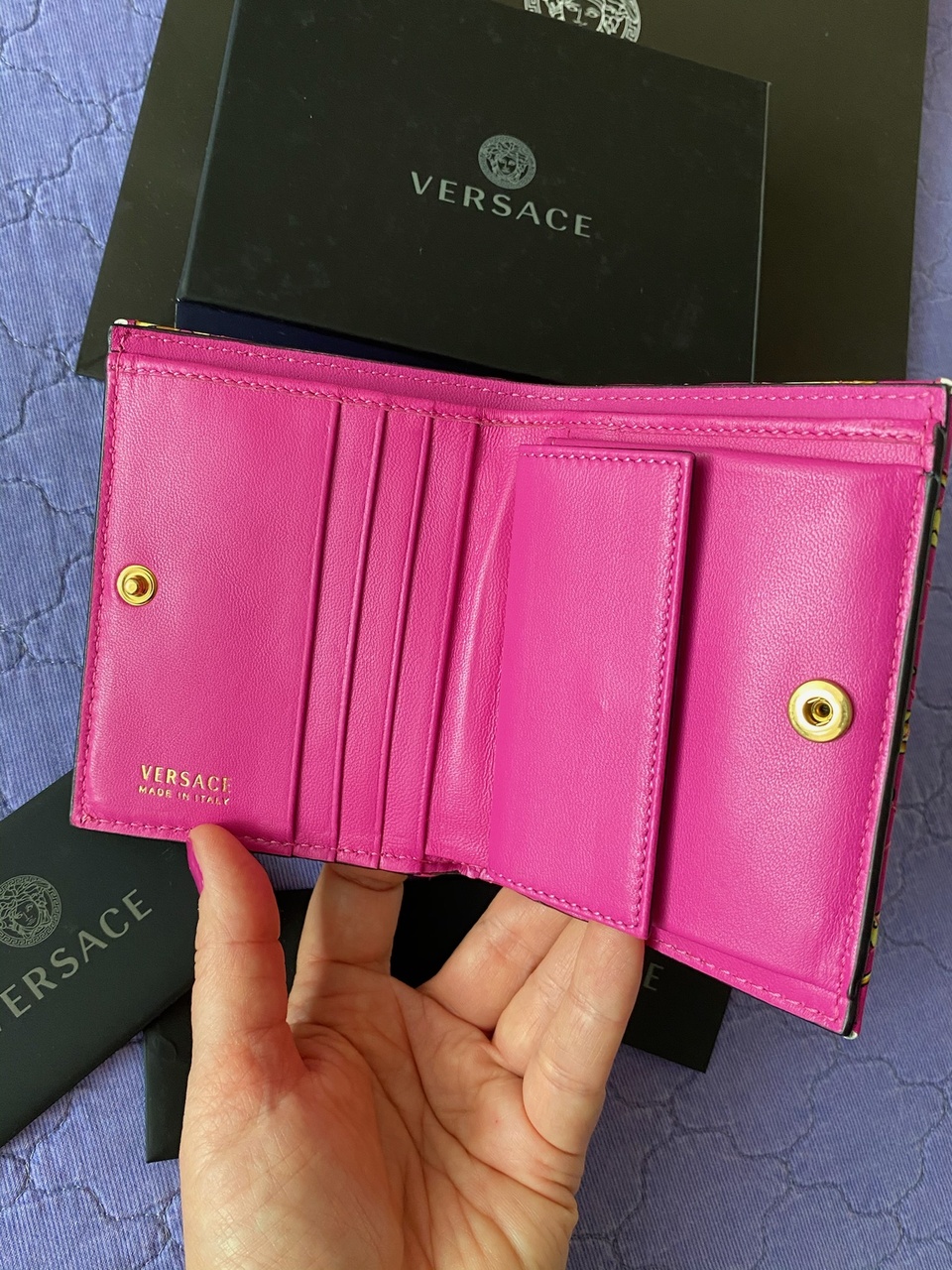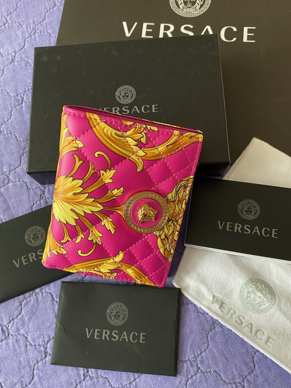 VERSACE. Женский кошелек. Среднего размера, на кнопке. НОВЫЙ. Гладкая стеганая кожа. Расцветка: розовый-фукси с золотым барокко