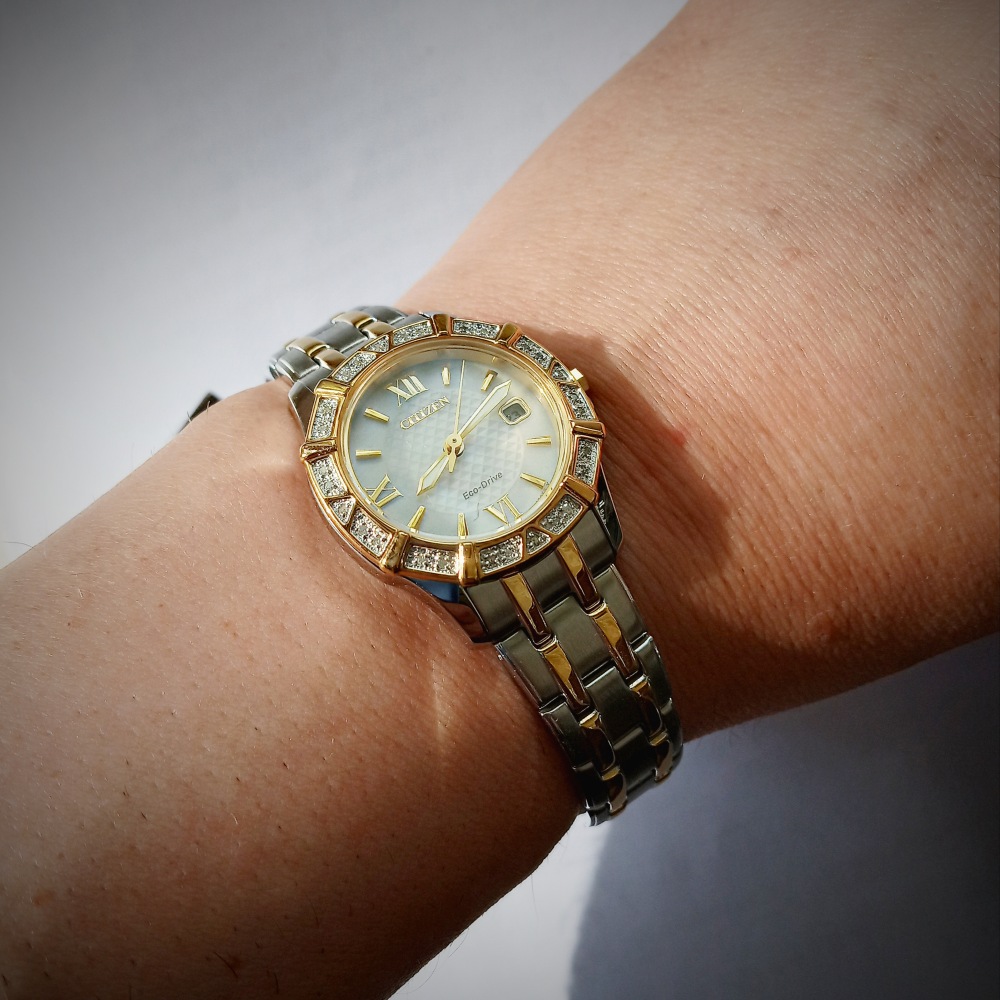 - Практичный японский кварцевый механизм с технологией Eco-Drive, позволяющей заряжаться батарейке часов от солнечного и искусственного света.