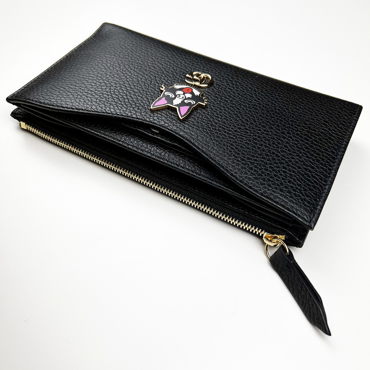 Клатч эффектно выглядит и имеет отличную функциональную организацию внутреннего пространства. Широко удобно раскрывается - на 180 градусов. Внутри размещены отделения для купюр, карманы и кармашки, слоты для карт, чеков и т.п., а также отделение на молнии, плюс торцевое основное отделение на молнии для купюр - которое расположено таким образом, что его можно открывать именно молнией сверху, не раскрывая сам клатч, что очень удобно.