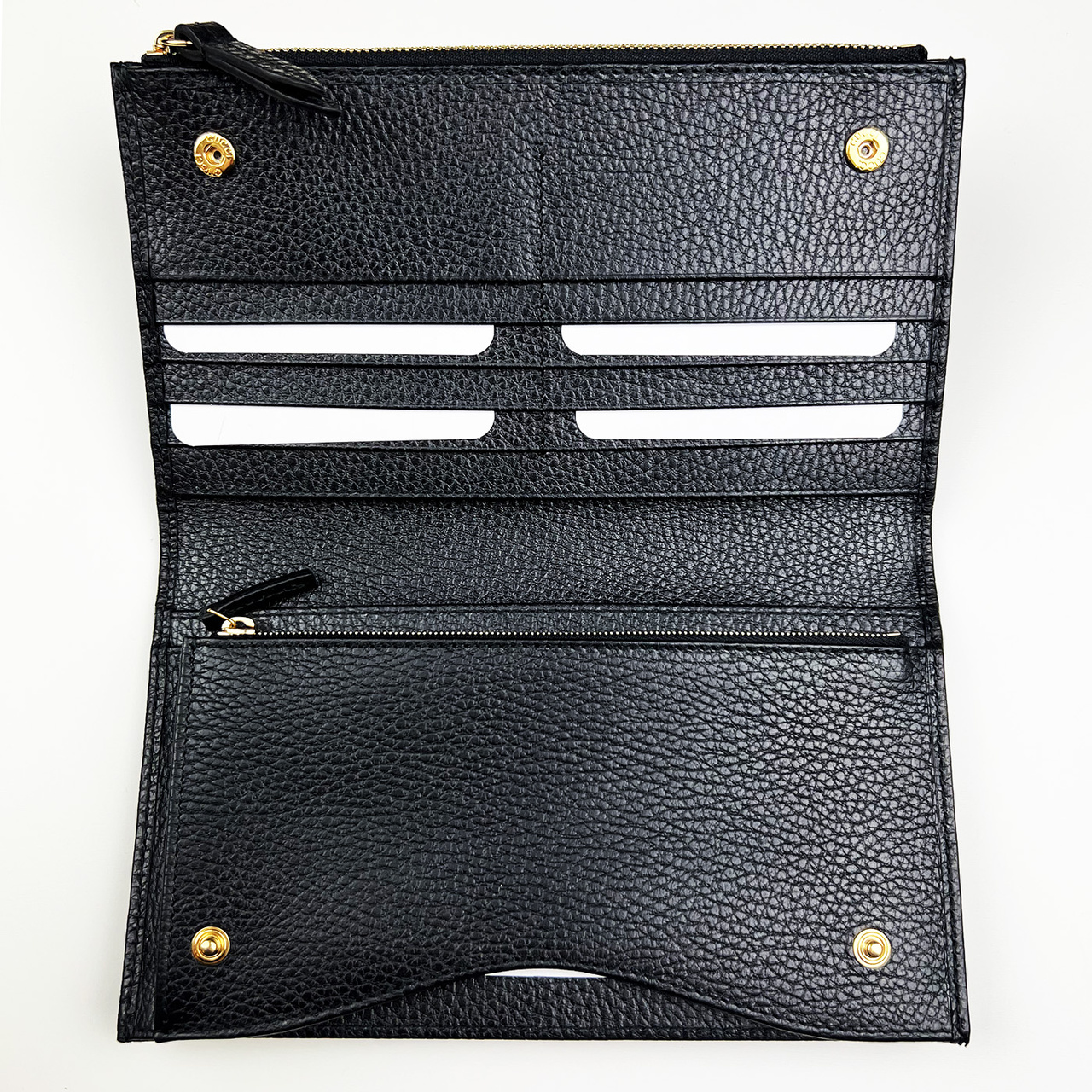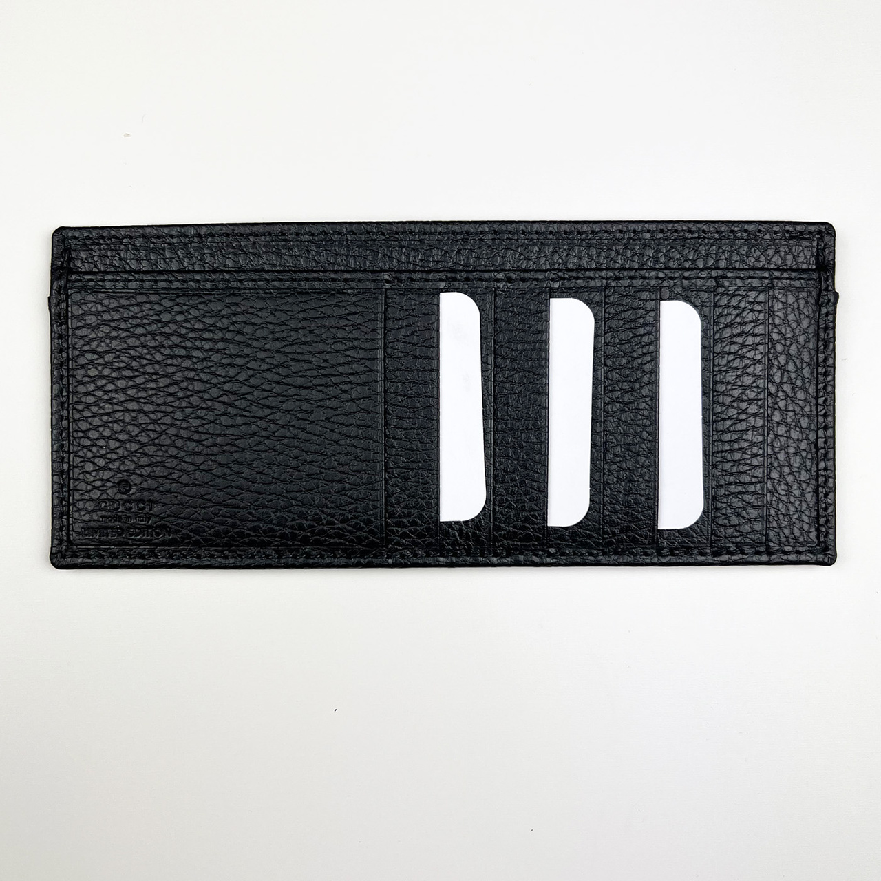 съемное отделение-кардхолдер. Кардхолдер выполнен из гладкой черной кожи, его можно носить как отдельную самостоятельную вещь. Кардходер размером 19 х 8,5 см имеет слоты для банковских карт, а также два отделения для сложенных купюр или чеков. В углу кардхолдера тиснением выполнено лого Gucci и надпись "Limited Edition".