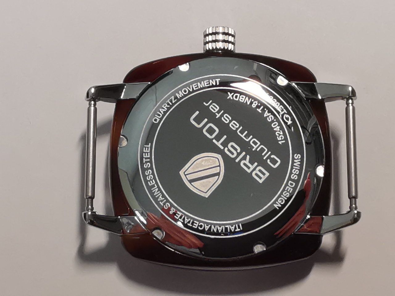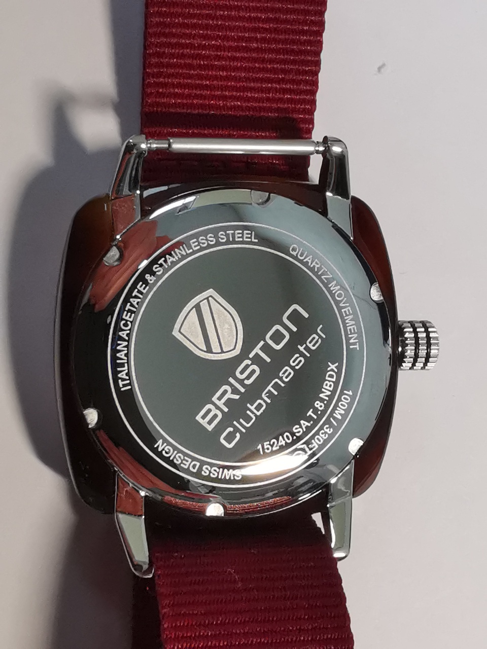 Задняя крышка слегка выпуклая, полированная, на резьбе. На крышке имется неглубоко гравированные надписи: italian acetate & stainless steel, quartz movement, 100m/330ft, swiss design, Briston Clubmaster, 15240.SA.8.NBDX