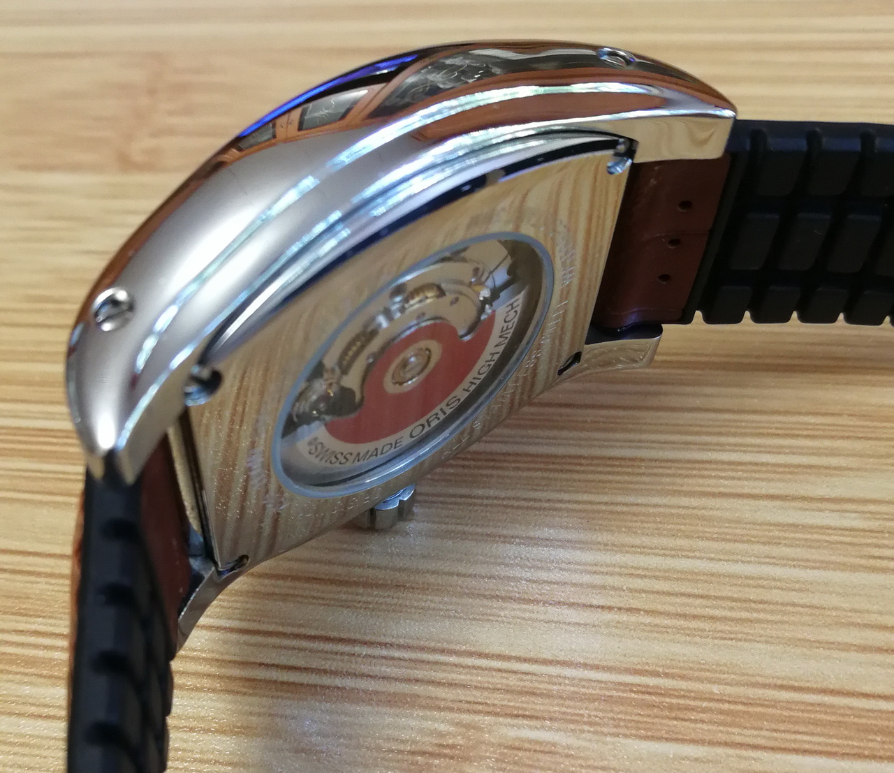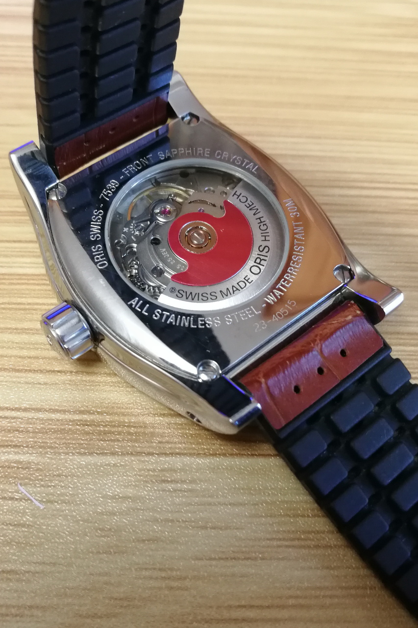 Механизм: Автоматический механический калибр Oris 635 на базе ЕТА 2836-2 (25 камней, частота полуколебаний баланса 28800 полуоб/час, противоударное устройство оси баланса Incabloc, размер механизма - диаметр 25,60мм, 11 1/2дюйма, стоп-секунда, мгновенная дата и день недели); Запас хода 38 часа. Точность хода не хуже -7 +18 сек./в сутки. Автоподзавод с двунаправленным вращающимся красным ротором.