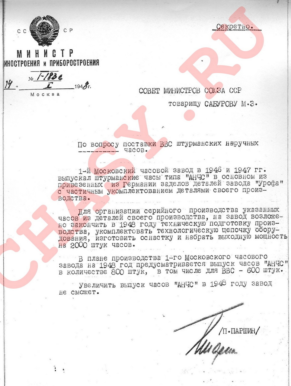 Оборудование и детали с фабрики UROFA-UFAG были переданы на 1МЧЗ, где уже в 1946 году стартовало производство часов АНЧС (Авиационные Наручные Часы с Секундомером), которые были копией того самого Tutima Flieger Chronograph.