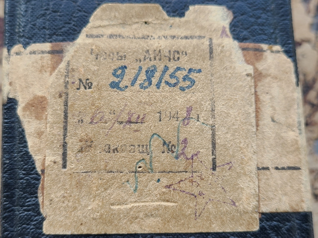 По датам выпуска часы с шестизначной и промежуточной нумерациями механизмов есть следующие материальные свидетельства. Во-первых, у меня есть родная коробочка от АНЧС с остатками фабричной упаковки, на которой написано «Часы АНЧС №218155, 30/XII 1948 г» (точное число декабря 1948 года просматривается неуверенно, то ли «10», то ли «30»).