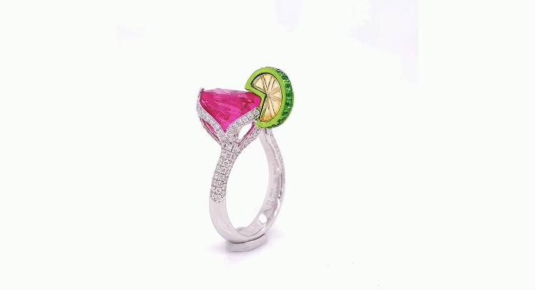 Вашему вниманию предлагаем приобрести эксклюзивное коктейльное кольцо выполненное из 18к белого золота, усыпанного брильянтами (1,066Ct) с центральным рубиновым турмалином (4,26Ct), а также зелёным цаворитом (0,17Ct) в виде кусочка лайма. Очень красивое и оригинальное кольцо! Видео по запросу.