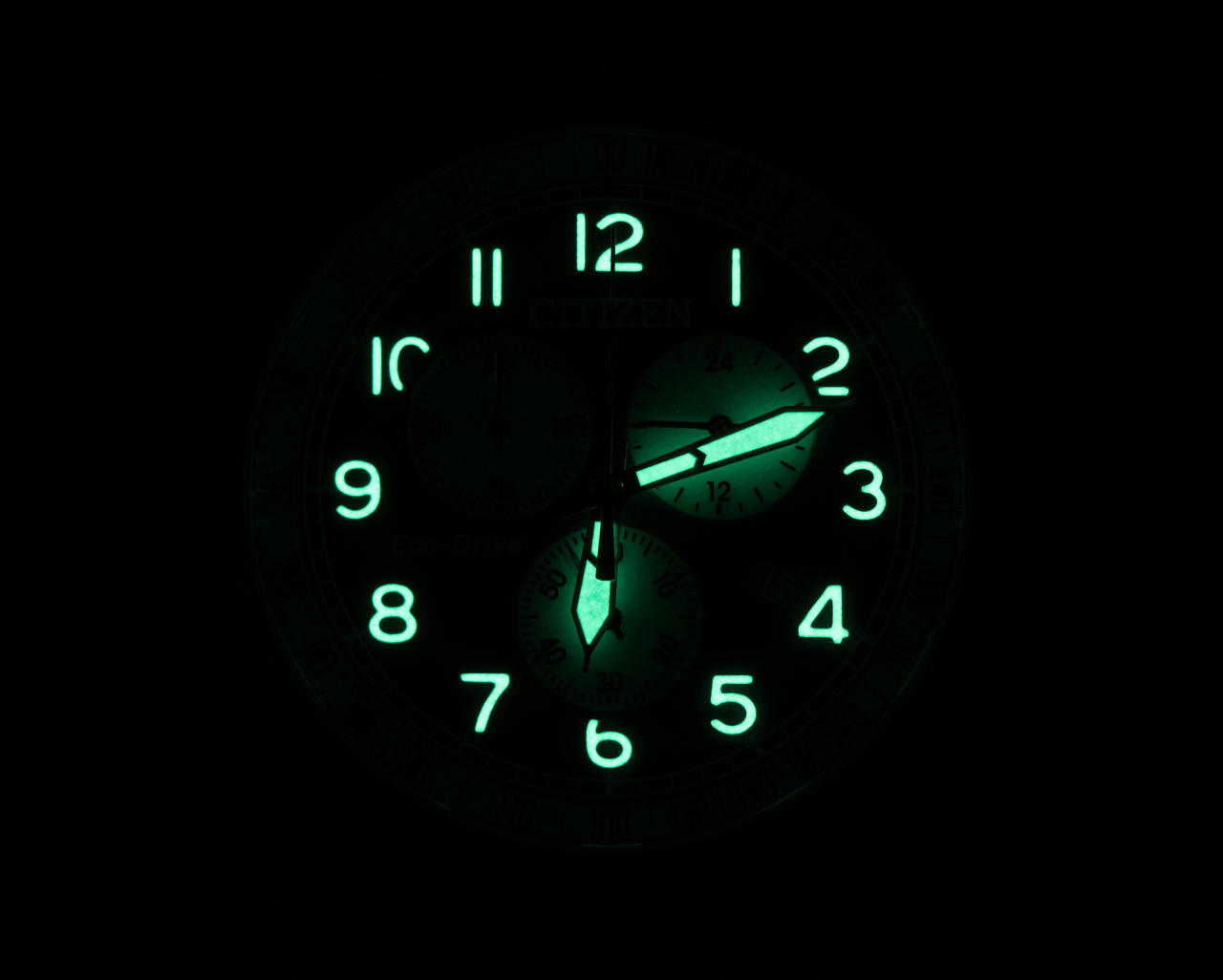 Люм зеленого цвета на стрелках и цифры светятся целиком!