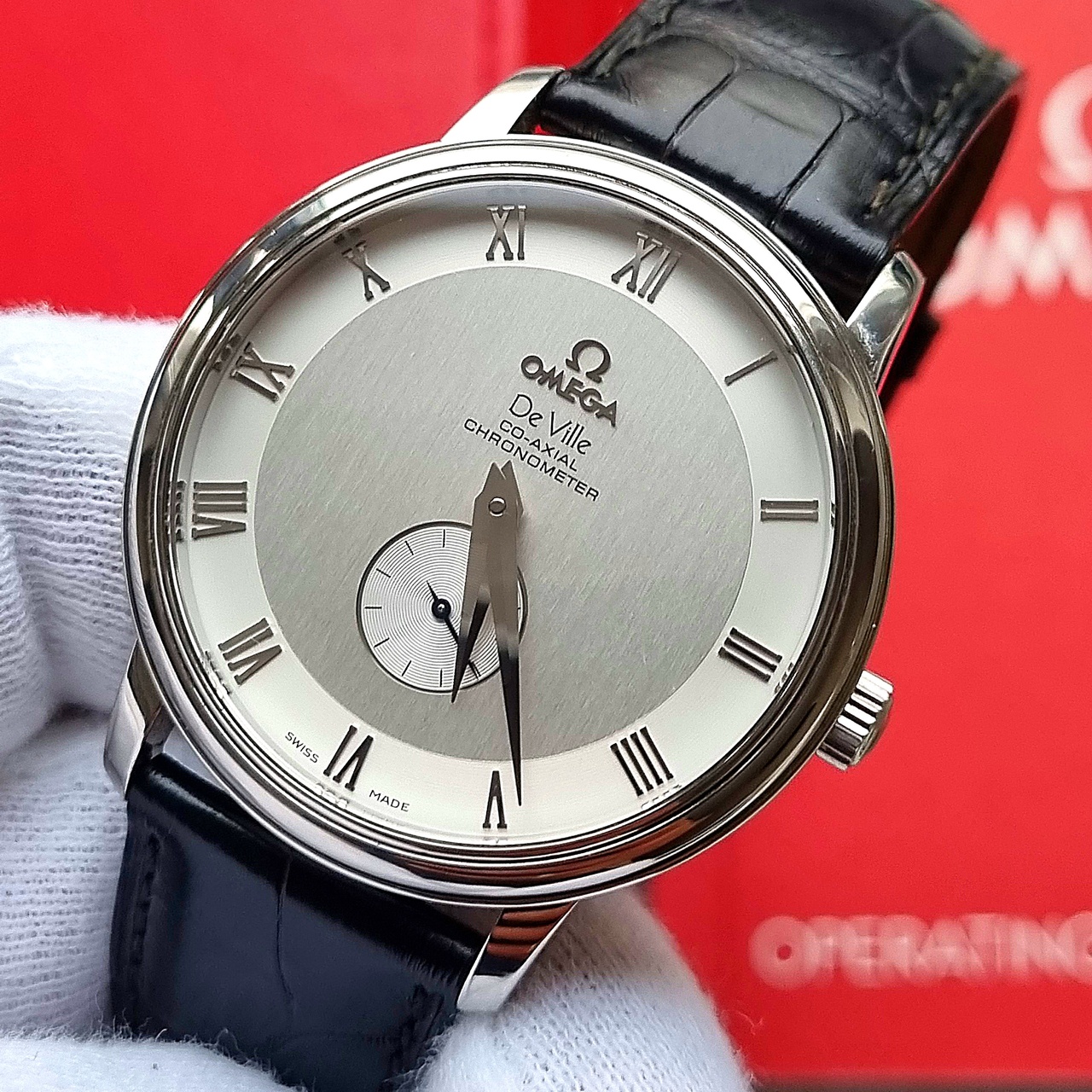 Отличный коаксиальный костюмник от Омеги в правильном 39 размере. Нетленная классика. Ничего лишнего вкупе со 100% узнаваемостью. Красивый двухзонный циферблат, меняющий цвет внутреннего контура от молочно-белого до темно серого- постарался на фото отразить. Вынесенный на 6 часов накопитель с вороненой секундной стрелкой. На знаменитом надежнейшем коаксильном калибре 2500. Полный комплект, куплены 25.10.2017г в Цюрихе. Родной ремень. Имеют естественные следы носки, ничего критичного, по желанию- полировка в подарок.