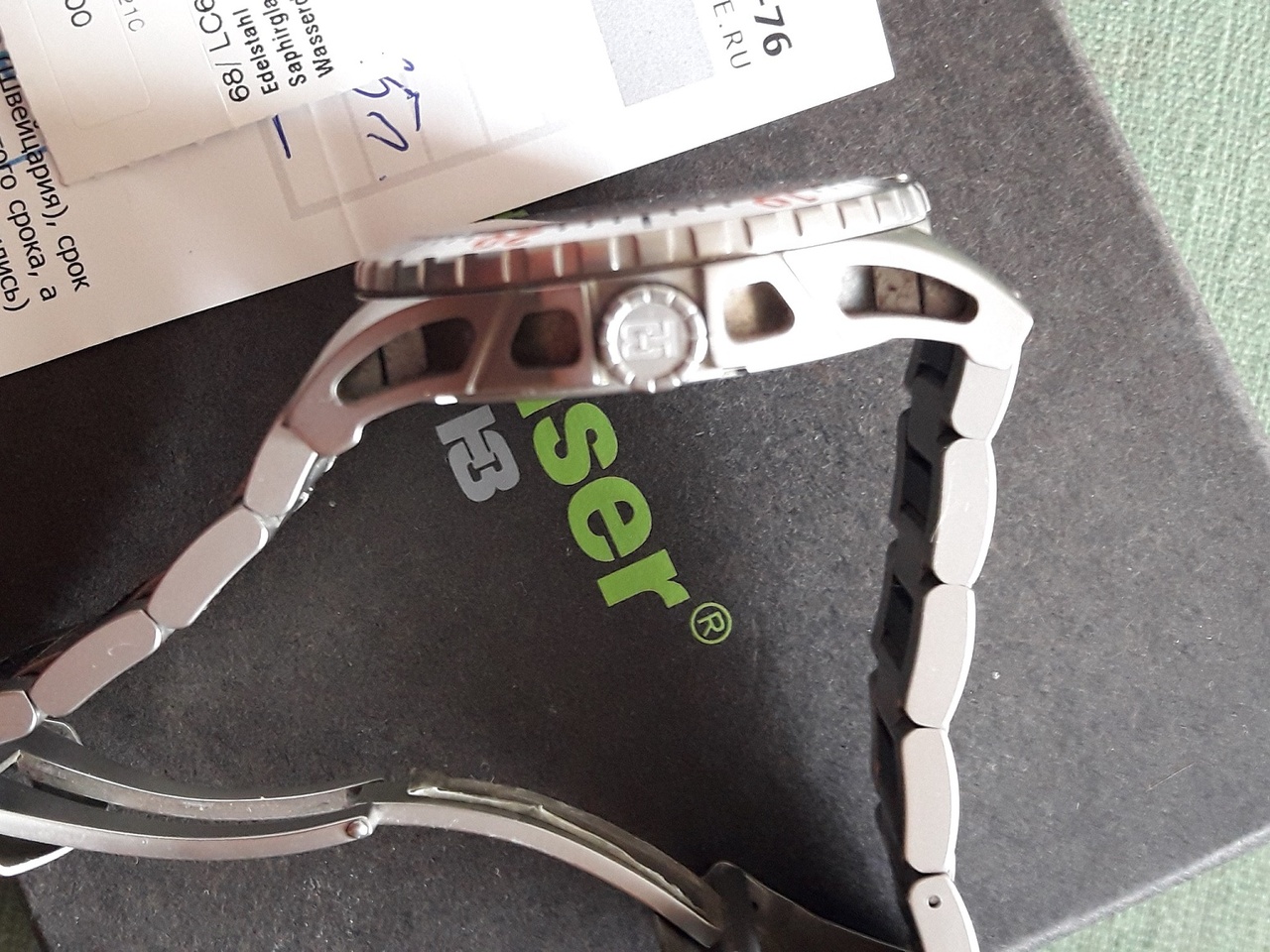 Продолжаю, не без сожаления, оптимизировать редеющую часовую коллекцию. На этот раз выставляются тактическо-экстримическо-спортивические здоровенные "Трасеры" на металлическом браслете со вставками. Любители тяжести и размера - вы их нашли! Часы в хитром двойном корпусе - часы-в-часах, которые, говорят, можно бросать на камень, топтать ногами, но кроме царапин на корпусе им ничего не будет! (правда, я не пробовал делать ни того, ни другого). WR целых 300 м, это надо еще поискать. В темноте прекрасно видны, поскольку у цифера и стрелок тритиевые колбы, которые горят все! Часам 8 лет, покупались за 740 ойро, документы и паспорт на удивление сохранились. Состояние - почти минт, кроме пары коцек на браслете, к которому есть еще пара звеньев. На офсайте traser есть похожие за 45 000, но - карбон, силикон и 200 м WR. Часишки достаточно тяжелые и на резких поворотах на хорошей скорости может заносить. Батарейка новая renata. Отправлю без торга СДЭКом за счет покупателя. На вопросы отвечаю. Правильный цвет секундной стрелки - цвет цифр "40" и "50" на лимбе