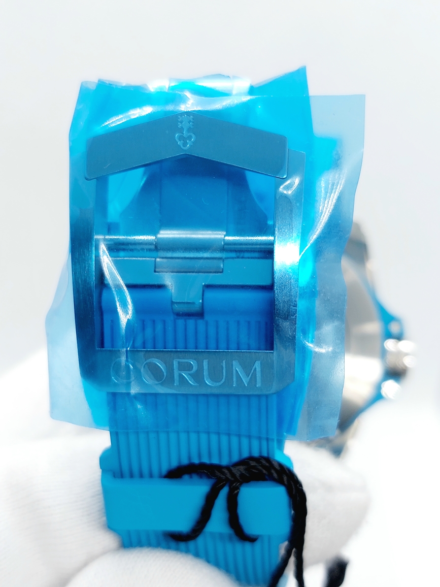 Часы комплектуются синим ремешком из каучука с тиснением, шириной 23/20 мм с браслетной застежкой тройного сложения.