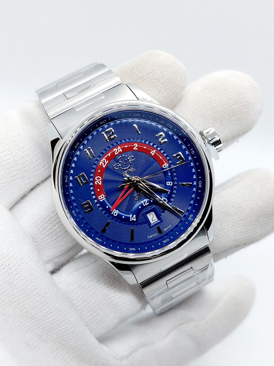 24-часовая шкала нанесена на внутренний круг циферблата. GMT время второго часового пояса показывает дополнительная стрелка.