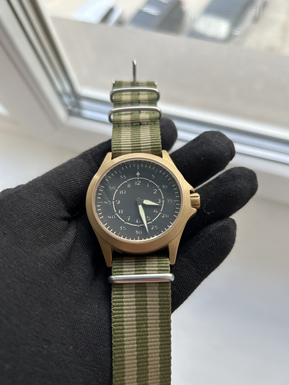 В продаже отличный экземпляр бездатых пилотов из латуни в формате двухстрелочника от дочернего бренда Zelos - компании Ventus. Черный цифер под сэндвич. Под капотом надежный и проверенный временем NH35 от Seiko. Ядерный люм зеленого цвета. Часы в хорошем состоянии, на уверенном точном ходу. Установлен новый отличный нато-ремешок зеленого цвета. В комплекте родная деревянная коробка, кожаный клатч для ремешков, родная бакля и дополнительный новый нато-ремешок черного цвета.