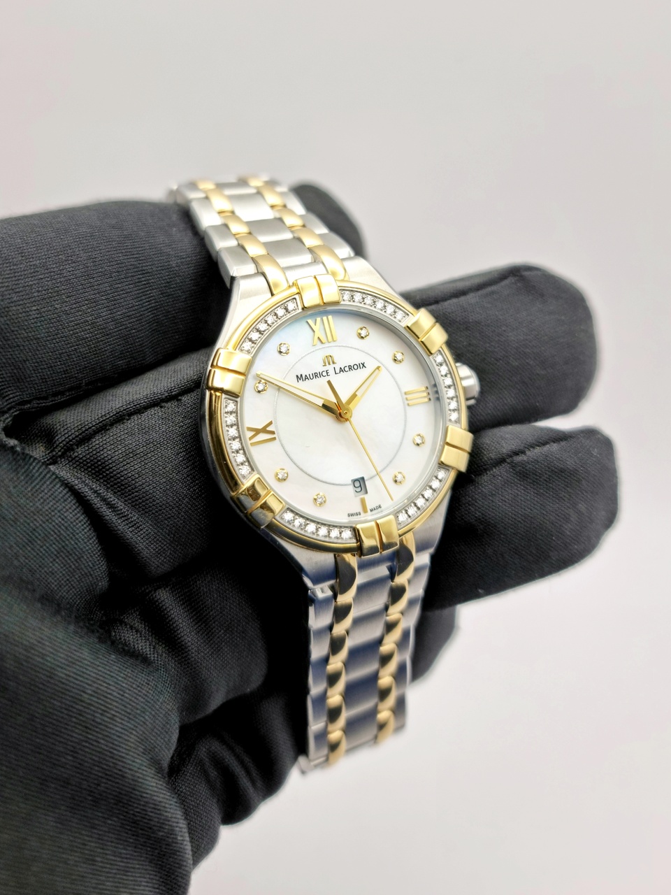 Часы выполнены в корпусе из нержавеющей стали с РVD покрытием жёлтого цвета размером 35 мм. Высокоточный надежный кварцевый механизм не нуждается в подзаводке, а также не боится ударов. Часы имеют водонепроницаемость 100 м. Циферблат закрыт прозрачным антибликовым стеклом из сапфира высокой прочности, благодаря чему обеспечивается максимальная защита от сколов и механических повреждений. Браслет выполнен из нержавеющей стали с РVD покрытием жёлтого цвета и комплектуется раскладывающейся стальной застежкой. Корпус часов украшают 36 бриллиантов, весом 0,25 карат. Циферблат перламутровый с 8ю бриллиантовыми метками.