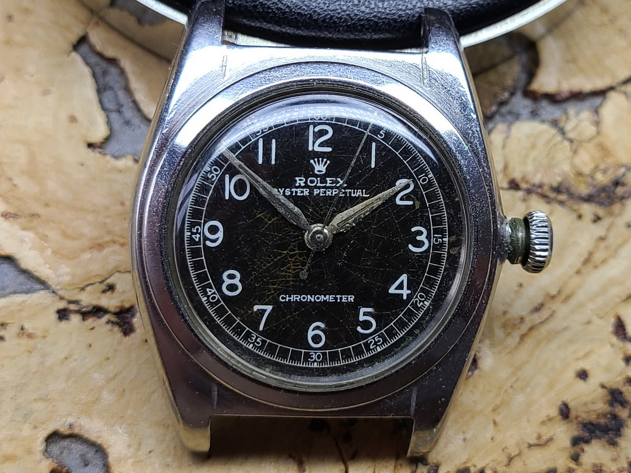 На фото часы Rolex «Bubbleback» ref. 2940 1945 года выпуска. Внутри механизм Rolex 630 образца 1931 года. Я предполагаю, что циферблат в моем Rolex неоригинальный. По крайней мере, мне не удалось найти аналогичный в интернете.