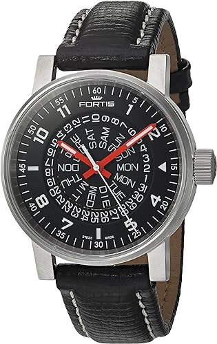 - Циферблат: черный; указатели: день недели и дата в положении 3-х часов. Индивидуальный дизайн циферблата, красные стрелки, цифры и метки покрыты люминесцентным составом Superluminova.