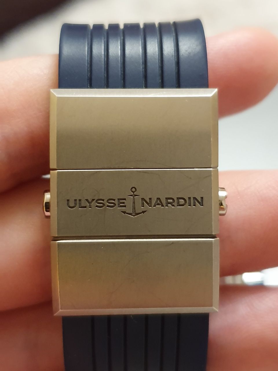 Имею в наличии классический синий хронометр ref. 263-67, изначально был на аллигаторе. Примерно год назад решил на лето приобрести каучук, в наличии нигде оригиналов не нашел, неоригиналы все выглядели убого, поэтому заказал полный комплект (каучук+вставка+клипса) через единственных оставшихся в Мс официалов. Везли мне его полгода, привезли зимой, с титановой вставкой и клипсой (я думал - будет сталь, ну да фиг с ним, забросил в шкаф). Пару месяцев назад достал, в приличном сервисе обрезал и поставил, ношу, радуюсь. И только с неделю назад присмотрелся и увидел, что на клипсе странный шрифт (не такой как на вставке) и якорь смотрит вертикально (а не под наклоном). На вставке - все так, как на всех других UN, что встречал, в том числе и на моих же UN Diver. Клипсы с дайвера и хронометра клал рядом, смотрел со всех ракурсов - кроме шрифта и якоря никаких отличий. Что скажете? Кто-то встречал такое чудо?