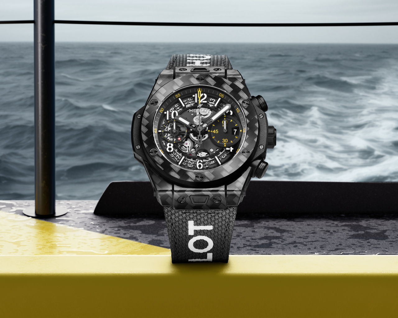 Новые часы Big Bang Unico Sailing Team поистине уникальны. В составе лимитированной серии только 100 экземпляров. Часы выполнены в черно-желтых тонах, как и яхта Алана Руры IMOCA. Этот выбор не является случайным: сочетание черного и желтого цветов в точности повторяет черно-золотой дизайн самой первой модели Hublot Classic Original в 1980-х годах. Речь идет об оригинальном сочетании желтого золота и черного каучукового ремешка. На протяжении более 40 лет эти часы являются визитной карточкой мануфактуры.