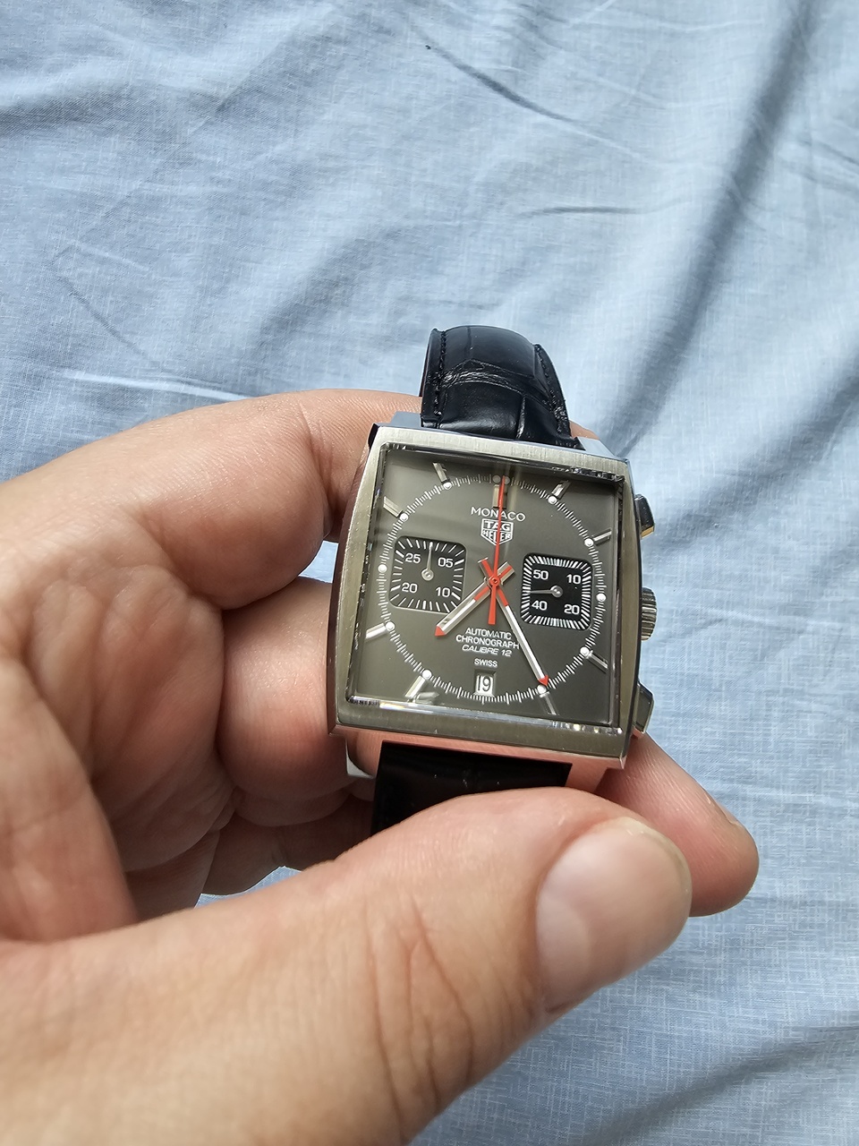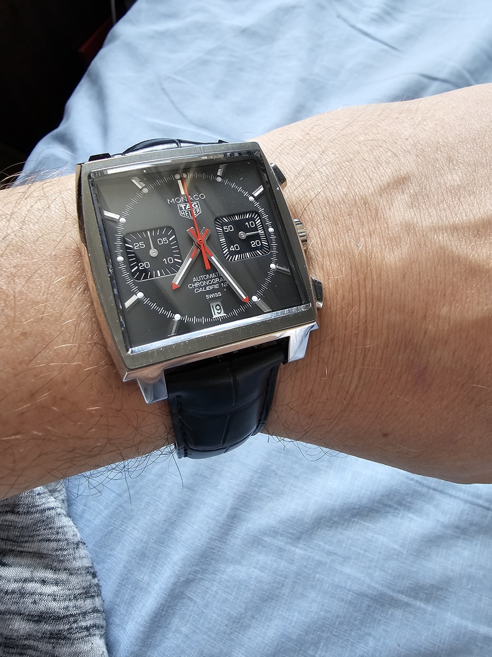 Для этой версии легендарного хронографа Monaco специалисты TAG Heuer сделали выбор в пользу серого рутениевого циферблата с матовой отделкой, к которому подобран черный ремешок из кожи аллигатора.
