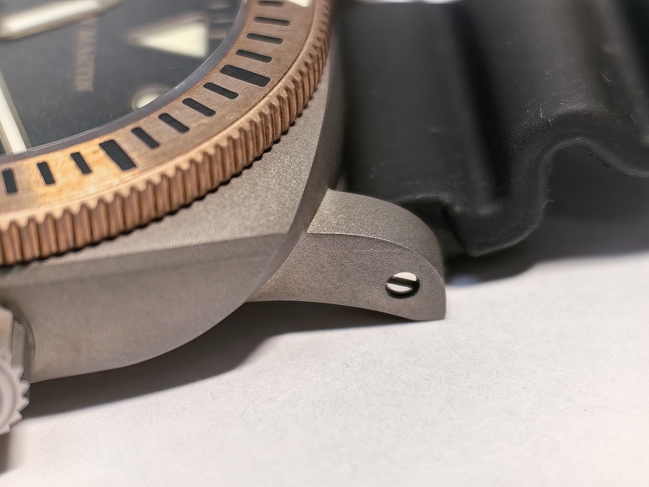 Что мне понравилось в этих часах. Понравилась упомянутая выше настройка механизма.(бывает и хуже) Обработка корпуса и задней крышки на очень хорошем уровне, острых кромок нет. Пескоструйно-матированная поверхность металла имеет теплый серый цвет, смотрится весьма необычно. Бронзовый безель оживляет облик часов, прямо из коробки он сверкает металлом. Спустя пару недель на руке появилась начальная патина и яркость блеска уменьшилась. Очень порадовал циферблат сэндвич. Часовые метки в этом варианте расположены немного ближе к центру и кажутся рельефными. Брендовая надпись и прочие обозначения на циферблате выполнены очень ненавязчиво и скромно краской цвета слегка патинированной бронзы. И, наконец, мои любимые мечевидные стрелки(так указано на сайте у производителя), золотые с хорошим люминофором. Ещё из приятных моментов хочу отметить резиновый(по информации производителя) ремешок, с мягкой матированной поверхностью, что перекликается с визуальным эффектом самого корпуса. Ремешок установлен на завинчивающиеся шпильки, что выглядит профессионально.