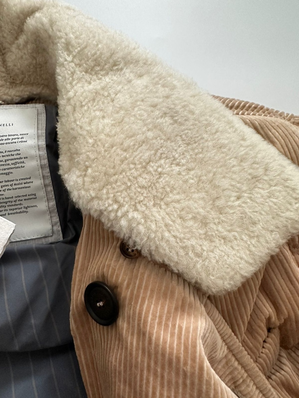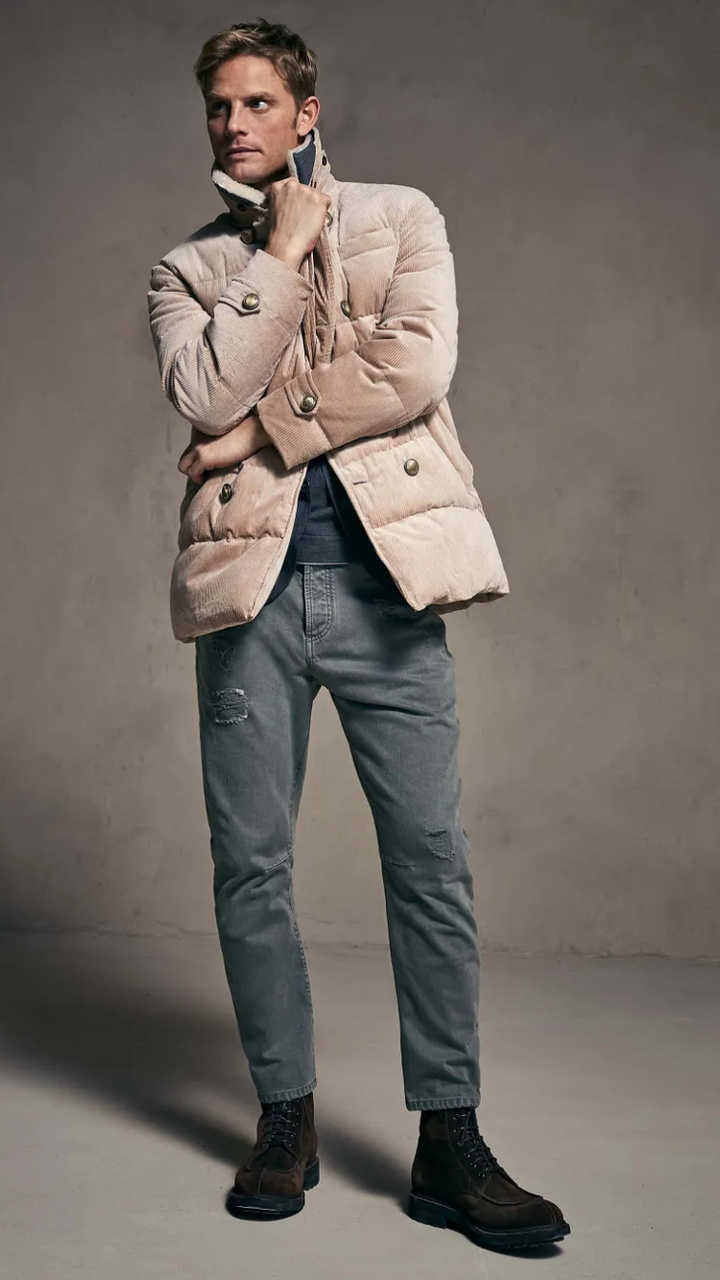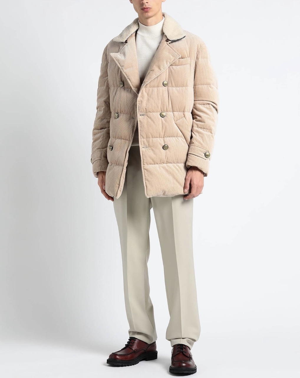 Бархатистая текстура вельвета подчёркивает сезонные оттенки и усиливает мягкость данного изделия.Вельвет из чистого хлопка-это классическая ткань зимнего сезона.Её легко узнаваемая текстура идеально подходит для создания модели в стиле двубортного пуховика.Куртка выполнена в светло-бежевом цвете,имеет застёжку спереди на металлические пуговицы,которые также придают элегантность внешнему виду:ручная отделка обеспечивает особенный «поношенный» эффект,что подчёркивает неоднородность их поверхности и делает каждый отдельный аксессуар уникальным.На отложном воротнике мягкая и воздушная текстура овчины украшает съёмную вставку:маленькие пуговицы,пришитые по краю воротника,позволяют легко отстегнуть аксессуар.Два прорезных кармана по бокам на кнопках,внутренние карманы на молнии и на пуговице,карман для ручки.Изделие утеплено слоем воздушного гусиного пуха,делая модель идеальным спутником в морозную погоду.Все виды пуха приобретены у поставщиков-членов европейской организации EDFA,которая гарантирует бережное отношение к окружающей среде и животным.Внутренняя отделка из водонепроницаемого нейлона обеспечивает комфорт.