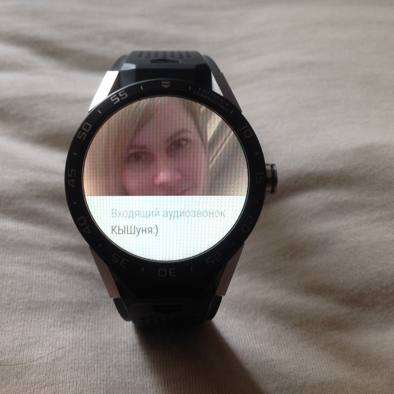 При пропущеном вызове, уведомление на часах: свайпом снизу-вверх=фото+ данные звонившего.