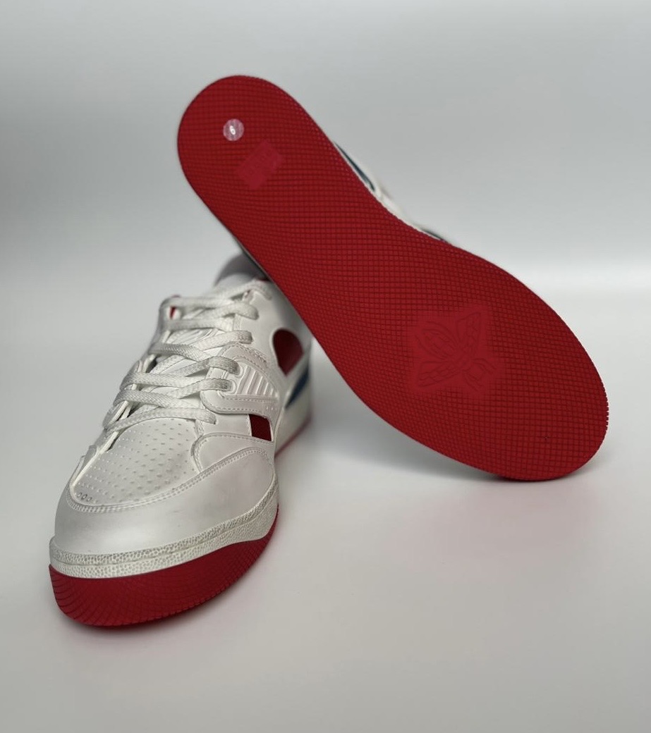Культовая модель сникеров выполнена из материала Demetra, нового экологичного материала, не содержащего элементов животного происхождения.Обувь белого цвета с закругленным перфорированным мысом,в сочетании с контрастными красными вставками,украшена искусственно созданными потёртостями,которые придают изделию винтажный эффект.Данная пара дополнена функциональной шнуровкой, толстой резиновой подошвой, логотипами на боковых панелях.