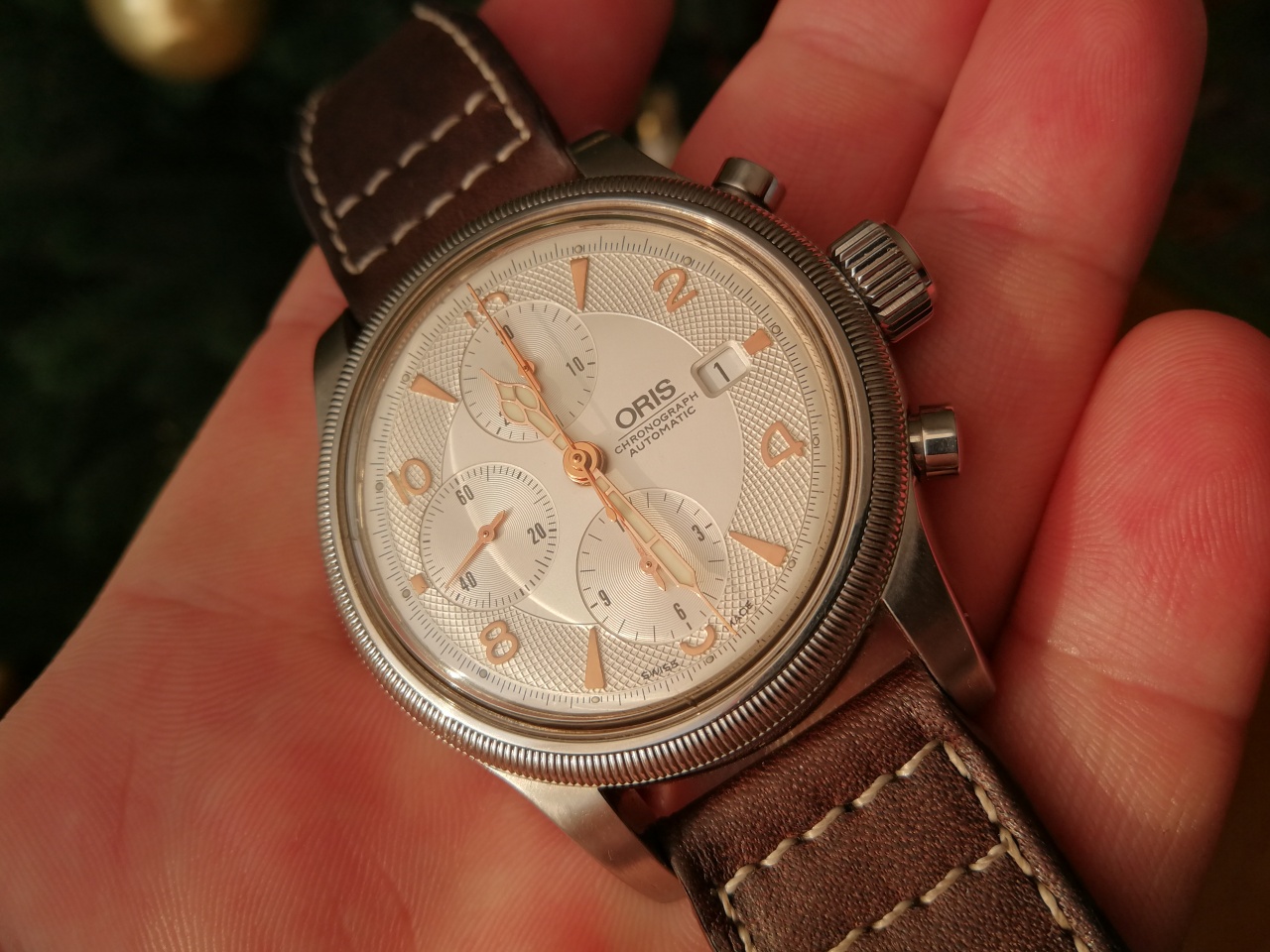 ORIS Big Crown Chronograph Oskar Bider 674 7567 43 61 Автоматический механизм калибр Oris 674 на базе Valjoux 7750 (25 камней; 28800 полуколебаний/час; запас хода 42 часа; противоударное устройство оси баланса Incabloc). Хронограф с точностью 1/4 сек. Дополнительные циферблаты: (12) 30 минутный накопитель; (9) смещенная секундная стрелка; (6) 12-ти часовой накопитель. Окошко даты. Автоподзавод. Фирменный ротор ORIS High Mech с красным полем. Запас хода 42 часов. Точность хода +1 сек./в сутки. Механизм производится с 1977 года.
